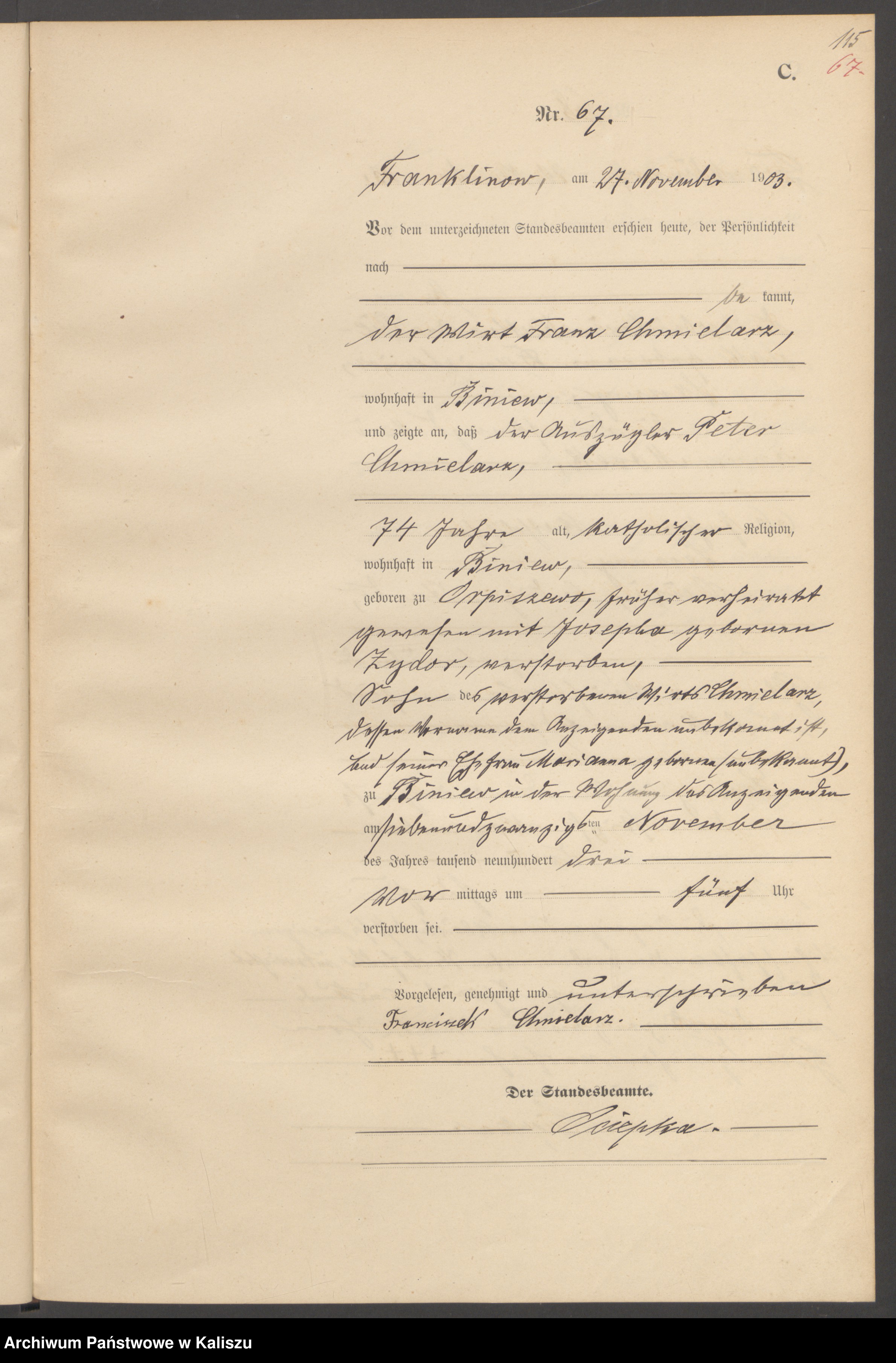 1.1903 Chmielarz Piotr akt zg.67 Biniew, Franklinów
