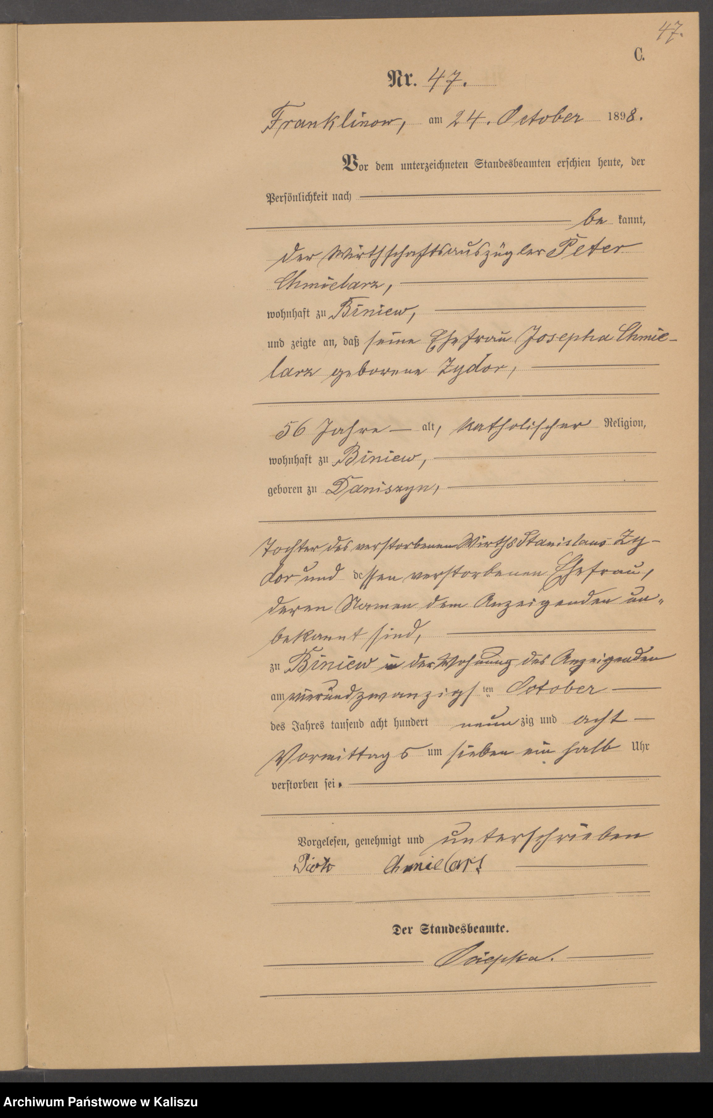 1898 Chmielarz Józefa zd.Zydor akt zg.47 Biniew,Franklinów