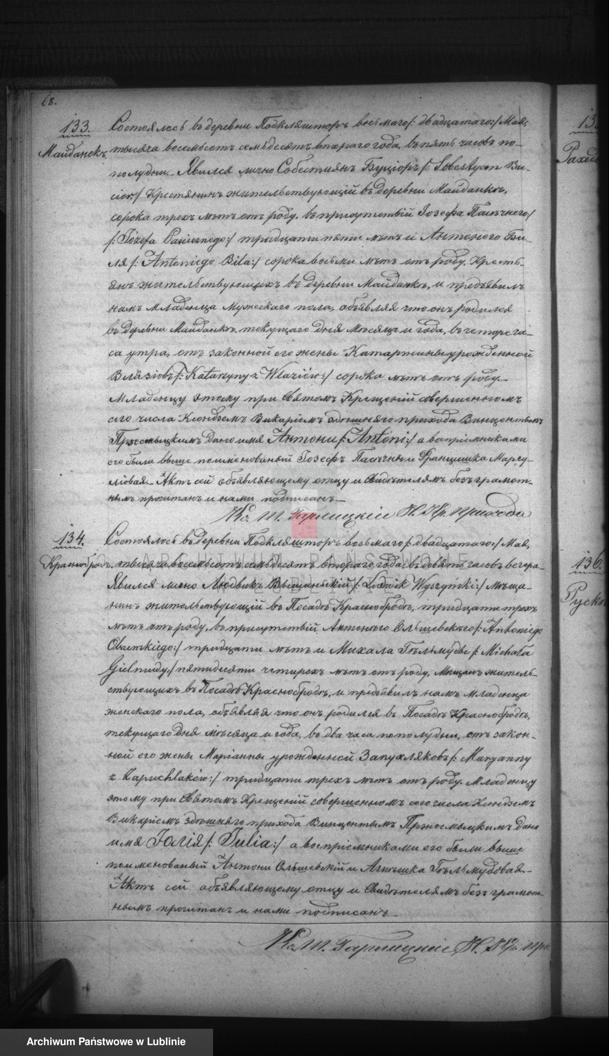 akt nr. 133, rok 1872 par. Krasnobród