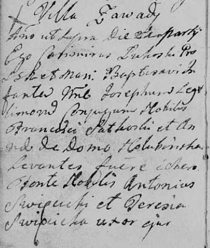 Ponieważ nie mogę odnaleźć aktu urodzenia oraz aktu (aktów) ślubu Teodora Myszczyńskiego, są zaś akty urodzenia jego kilkorga dzieci począwszy od 1761 roku, prosiłbym o przetłumaczenie fragmentów załączonych akt jedynie w kontekście Teodora.