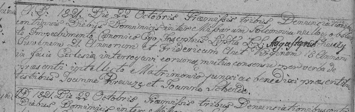Bardzo proszę o przetłumaczenie aktu ślubu Augusta Kuczy(?) z Fryderyką Aut, parafia Wieluń, 22.10.1821 r. :