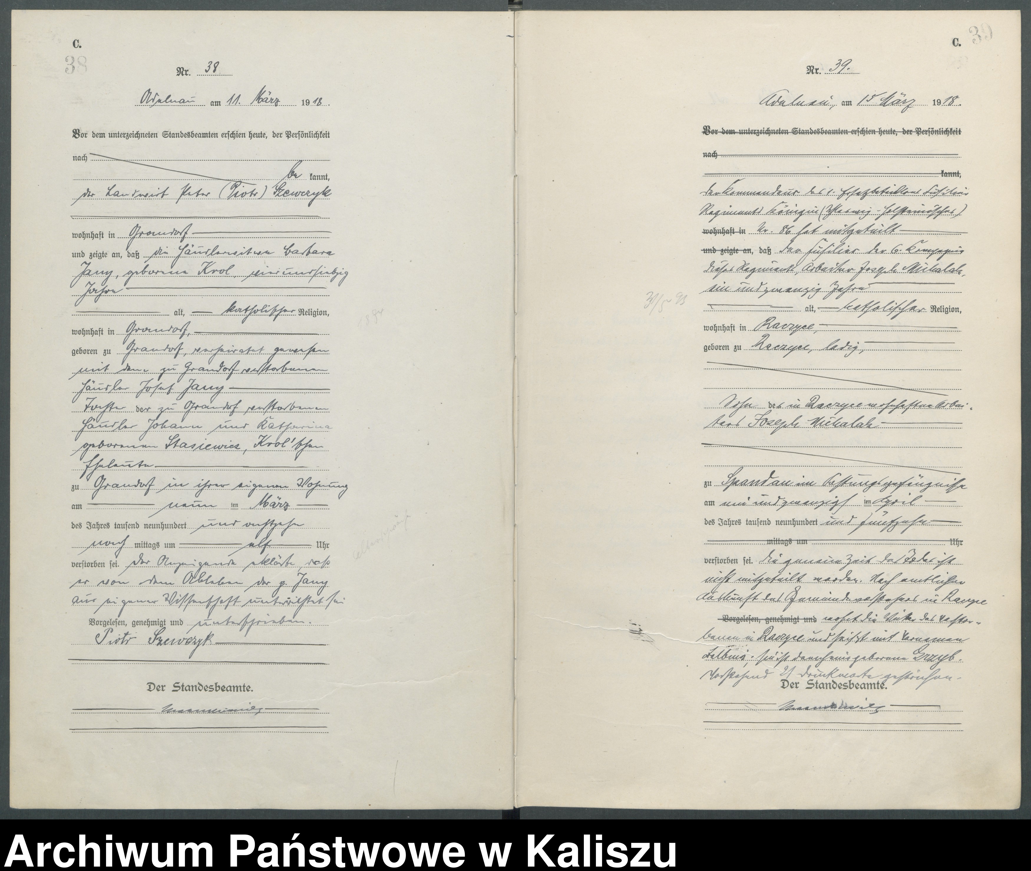 Akt zgonu, Józef Michalak, Odolanów 1918 - ok