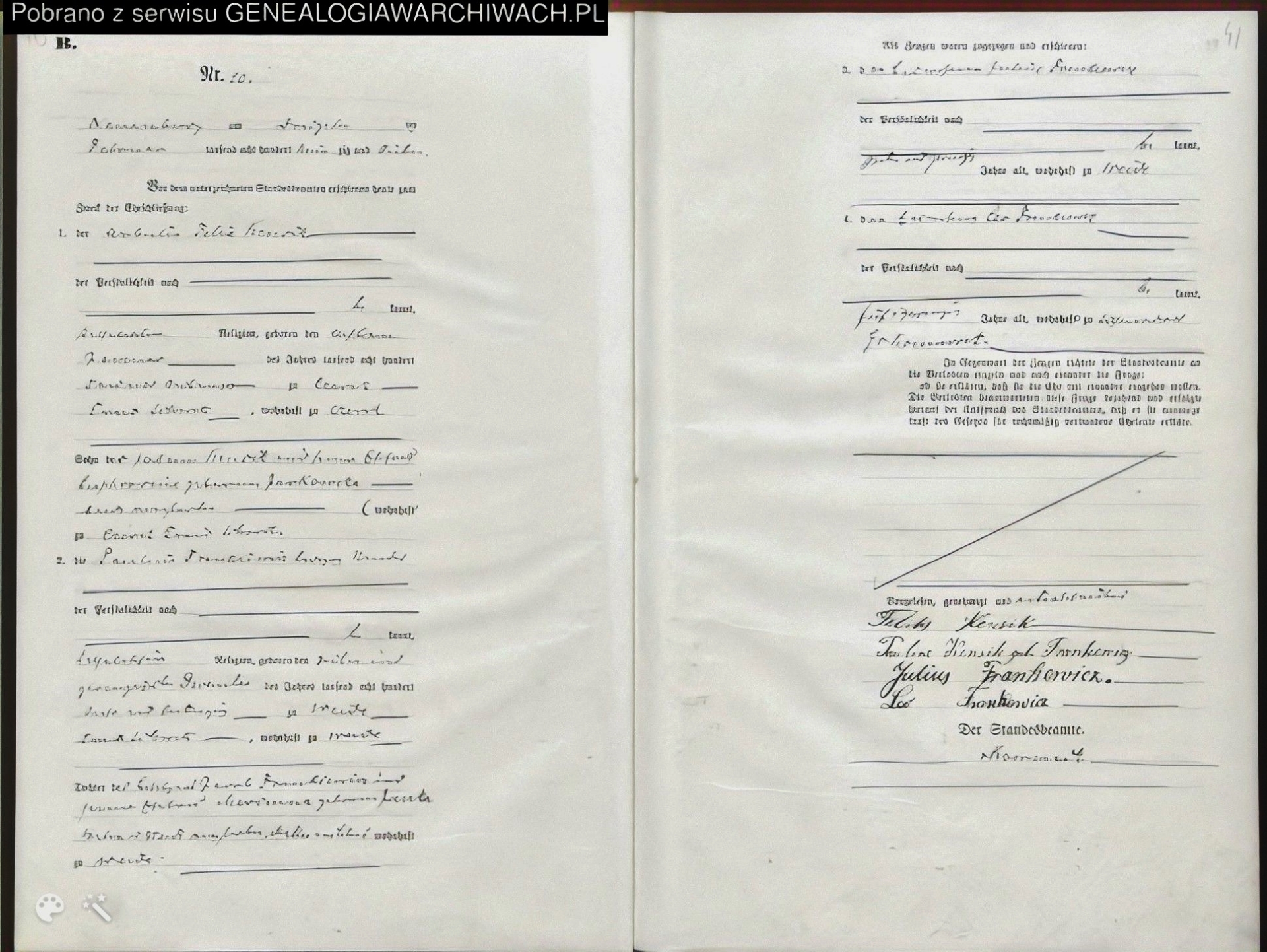 Akt małżeństwa nr 10 ? z 1897r. pomiędzy Feliks Kęsik (1873-1949) ur. w Czersk Świecki i Paulina Frankiewicz (1876-1919) ur. w Komórsk Wielki. https://images91.fotosik.pl/700/2e9d1e456b4f8e0f.jpg Z bardzo dziękuję.