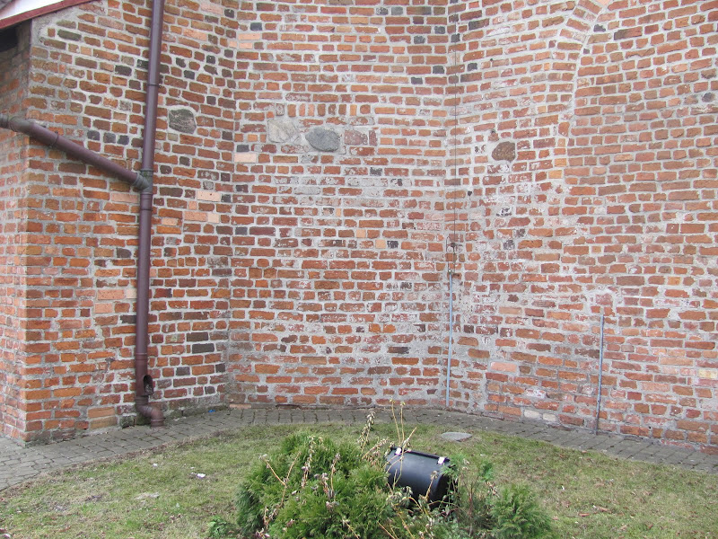 Powróćmy do kamieni w licu budynku. Zdjęcia nr 3 i 5 (Longin – zdjęcia zginęły). Uwagę moją zwrócił układ spoin narożnika przypory od strony przybudówki. Niestety, jej otynkowanie uniemożliwia dokonanie dogłębnej analizy. Odnoszę wrażenie że część narożnika od strony przybudówki na długości ok. 1 m uległa zniszczeniu i została odbudowana. Ponieważ zabrakło cegieł o historycznych wymiarach, na końcu uzupełnienia wykorzystano kamień.