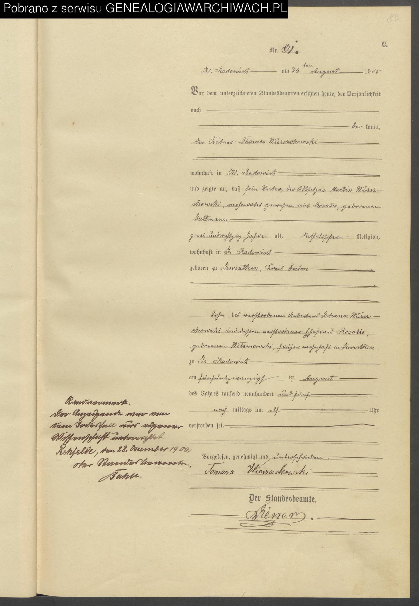 Zwracam się z uprzejmą prośbą o przetłumaczenie na język polski Aktu Zgonu Marcina Wierzchowskiego. Będę wdzięczny również za przetłumaczenie notatki, która znajduje się na marginesie.
