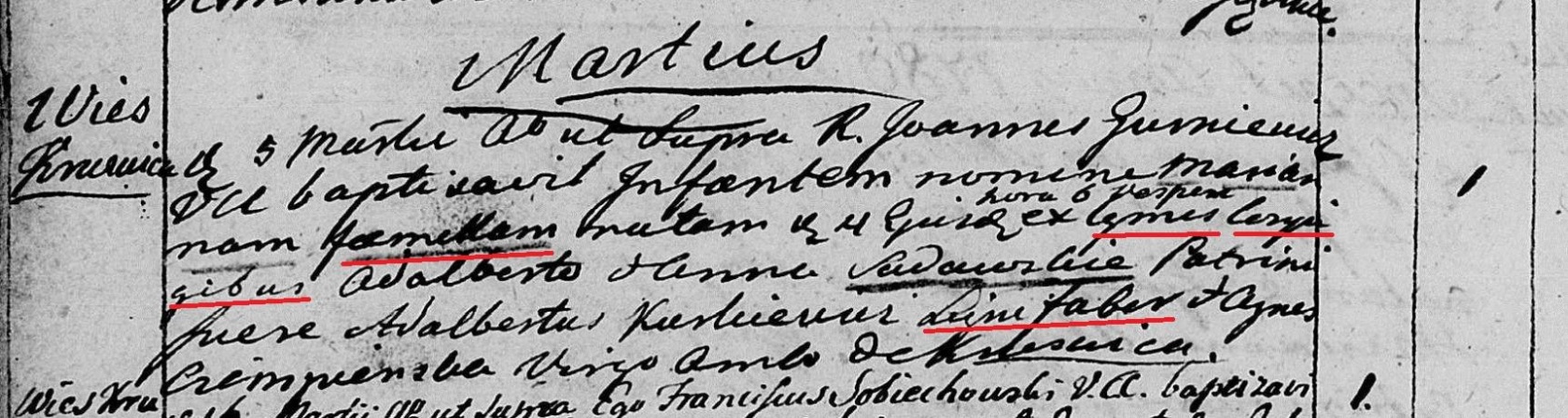 "Dnia 5 marca roku jak wyżej[1780], Wielebny Jan Gurniewicz, wikariusz kolegiaty kruszwickiej, ochrzcił dziecko imieniem Marianna Famellam?, urodzone tegoż dnia o godz. 6 wieczorem, z ?? ?? Adalberta i Anny Sadowskich. Rodzicami chrzestnymi byli Adalbert Kurkiewicz, ? rzemieślnik i Agnieszka Czempieńska, panna, oboje z Kruszwicy."