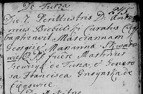 chrzestni: Marcin Szewczyk z Turzy; urodzona Franciszka Gnoińska z Cięgowic