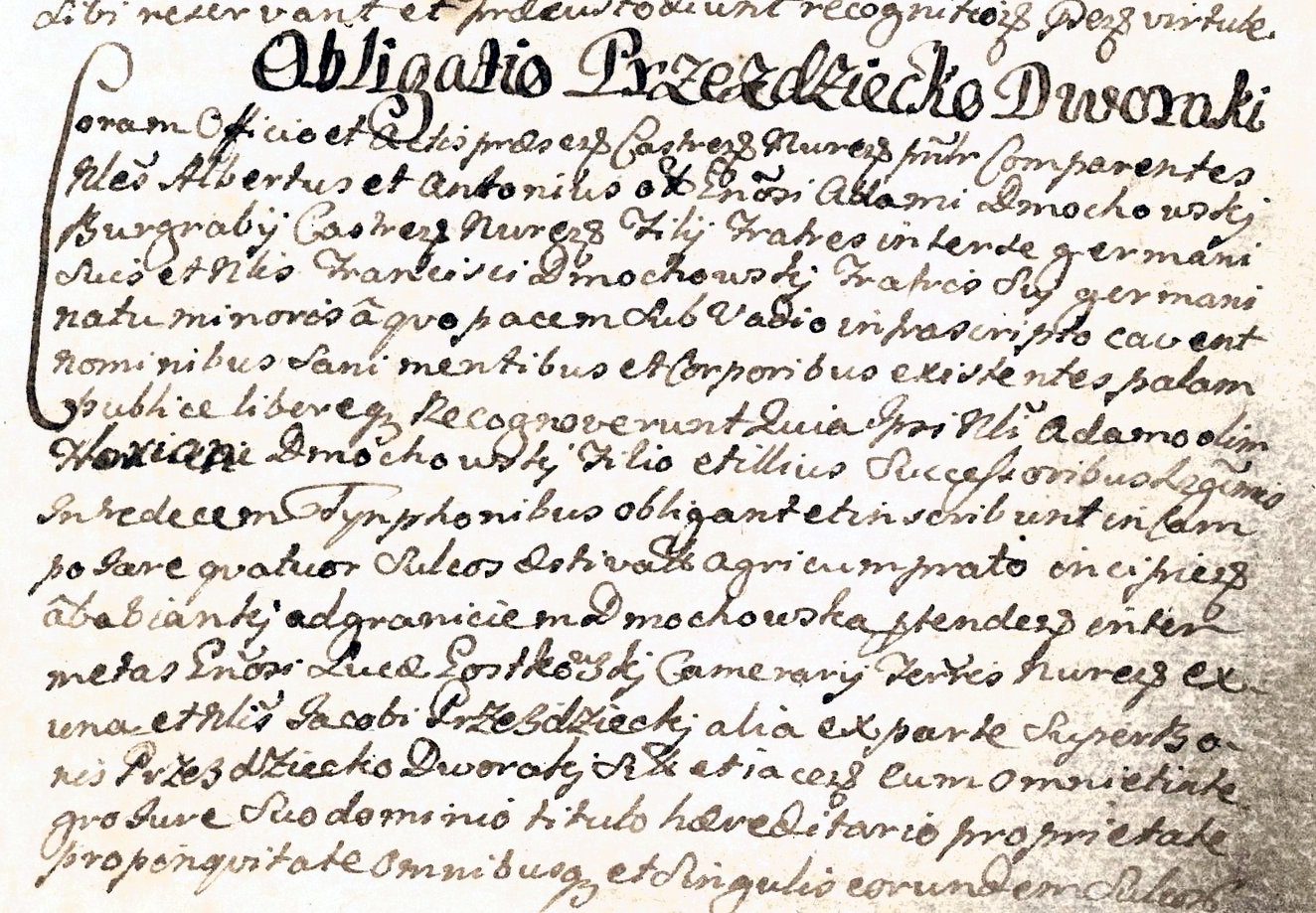 Zastawa Przeździecko-Dworaki; N. Wojciech i Antoni niegdy G. Adama Dmochowskiego burgrabiego grodzkiego nurskiego synowie swoim i N. Franciszka Dmochowskiego brata swego rodzonego młodszego imieniem, od którego pokój ręczą zastawiają N. Adamowi niegdy Floriana Dmochowskiego synowi w polu jarym cztery zagony roli z łąką rozpoczynające się od ? i ciągnące się do granicy Dmochowskiej między niedzami G. Jakuba Gostkowskiego komornika ziemskiego nurskiego z jednej i N. Jakuba Przeździeckiego z drugiej strony leżące na dobrach Przeździecko-Dworaki w sumie 13 tynfów.