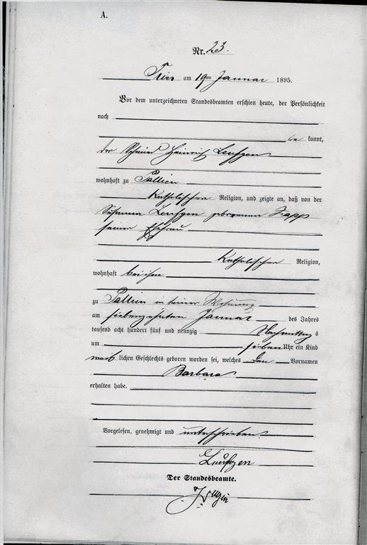 Zglasza kowal Heinrich zam. Pallien, ze Susanna dd Zapp jego oo , katoliczka zamieszkala przy nim dnia 17.1. po poludniu o 7 urodzila dziecko pl.z. Barbara