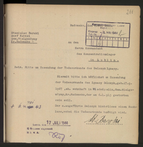 Dot. Prośba o przesłanie aktu zgonu Delczyka Ignacego.