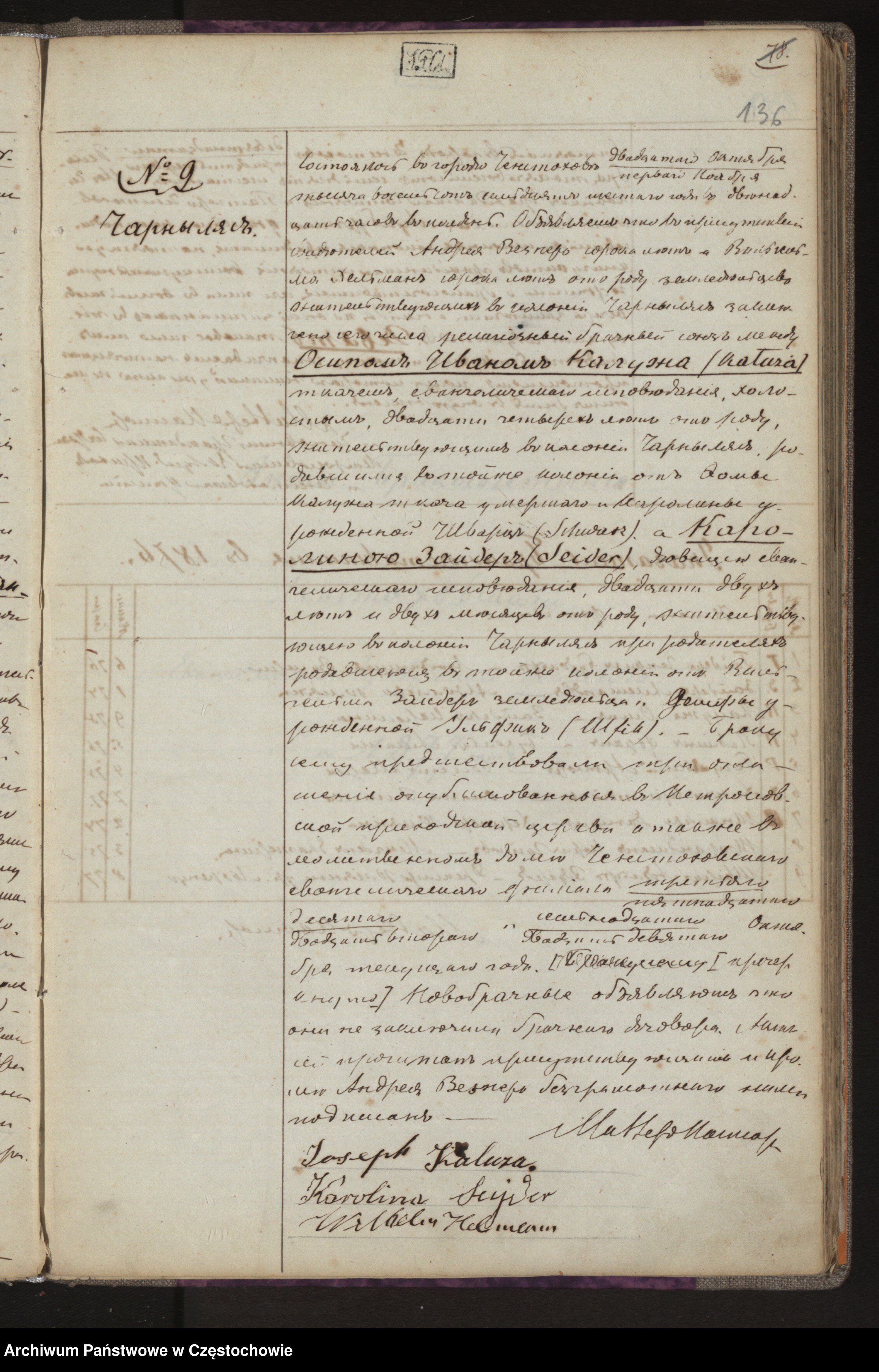 Młoda: Karolina Seider, panna, wyznanie ewangelickie, lat 22 i 2 m-ce, ur. i zam. przy rodzicach w wiosce Czarnylas, córka Wilhelma Seider rolnika i Józefy zd. Ulfik.