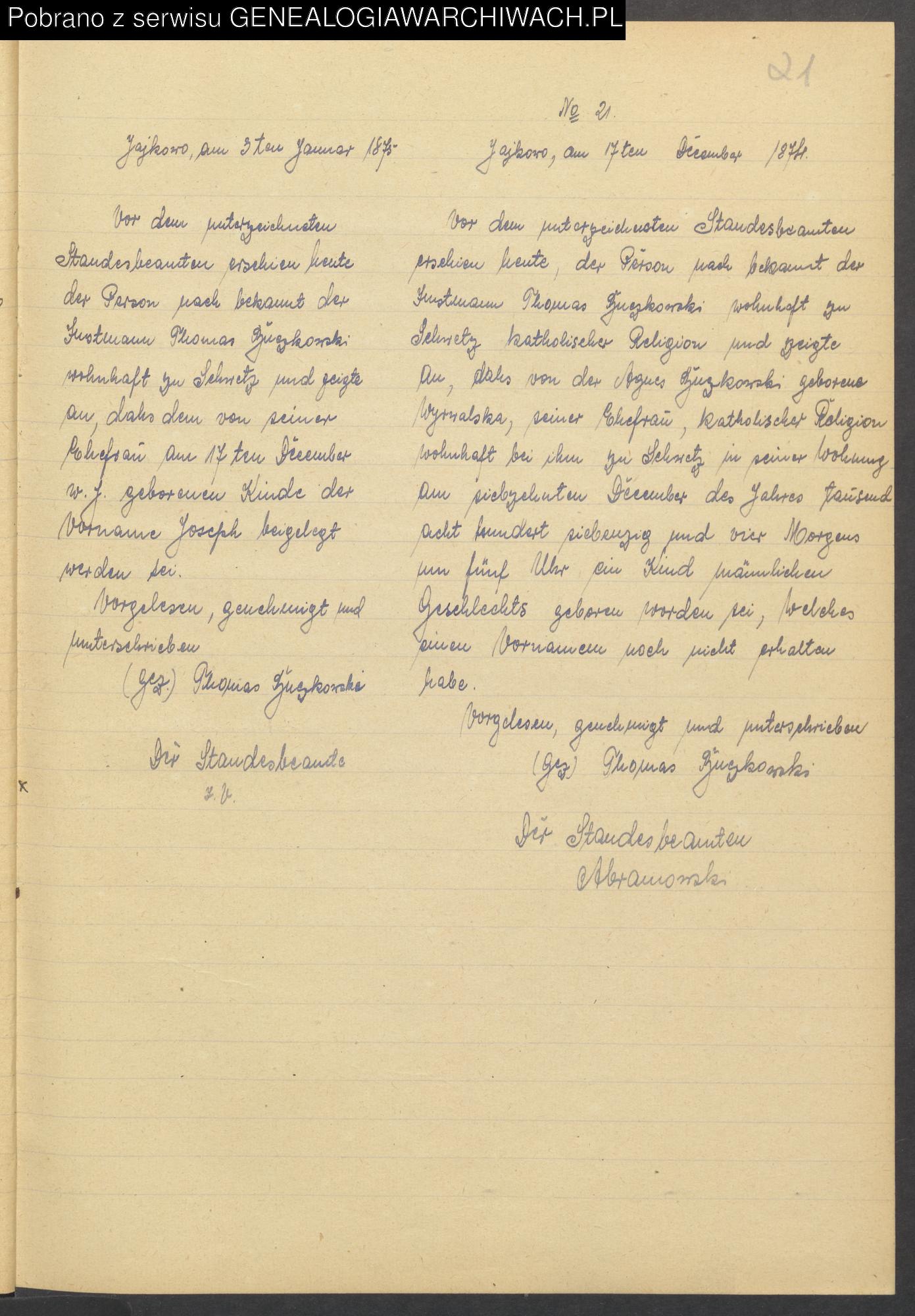 Stawil sie tozsamosci znanej , komornik Thomas Buczkowski zam. Schwetz, katolik i zglosil,ze Agnes Buczkowski dd Wyrwalska jego malzonka, katoliczka zamieszkala przy nim w jego mieszkaniu dnia 17.12. 1874, rano o godz. 5 urodzila dziecko plci meskiej, ktore jeszcze nie otrzymalo imienia.
