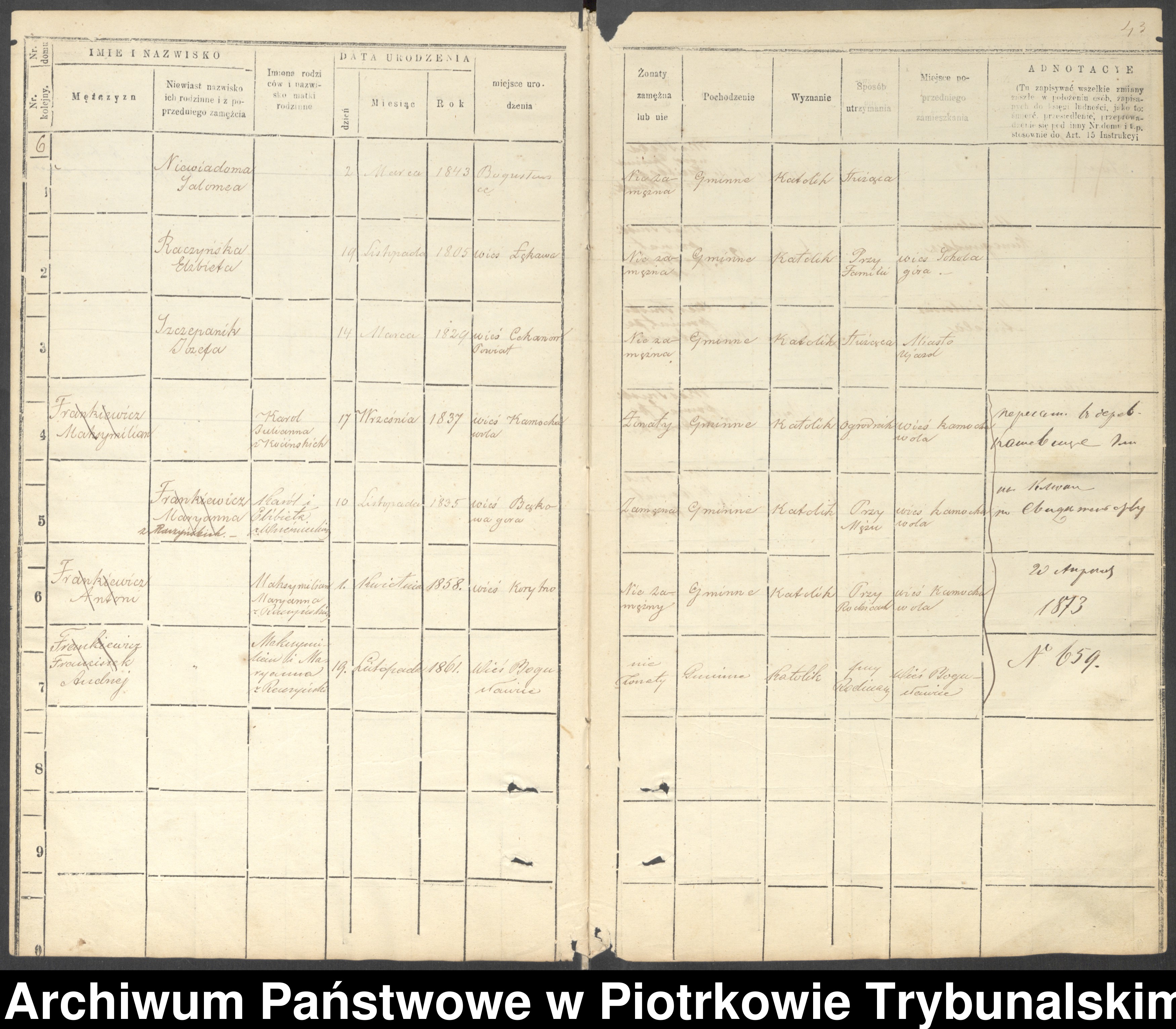 Frankiewicz Maksymilian ur.17.09.1837 r.Kamocka Wola,Ogrodnik ,adnotacja o wyprowadzce do Kaszewic?