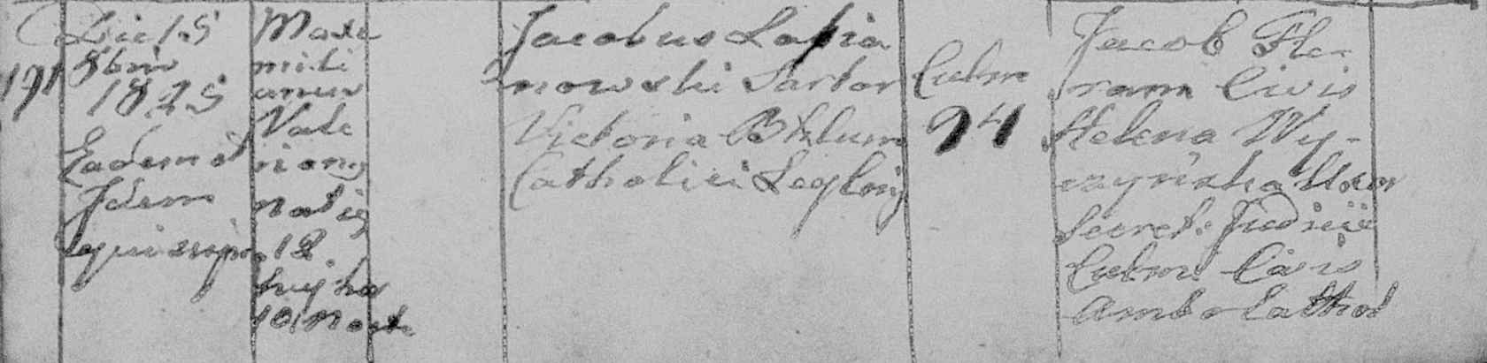 Rodzice: Jakub Lopianowski (ale powinno być Łopianowski) satror (krawiec ?) oraz Viktoria Blum, katolicy, zamieszkali Chełmno nr 94;