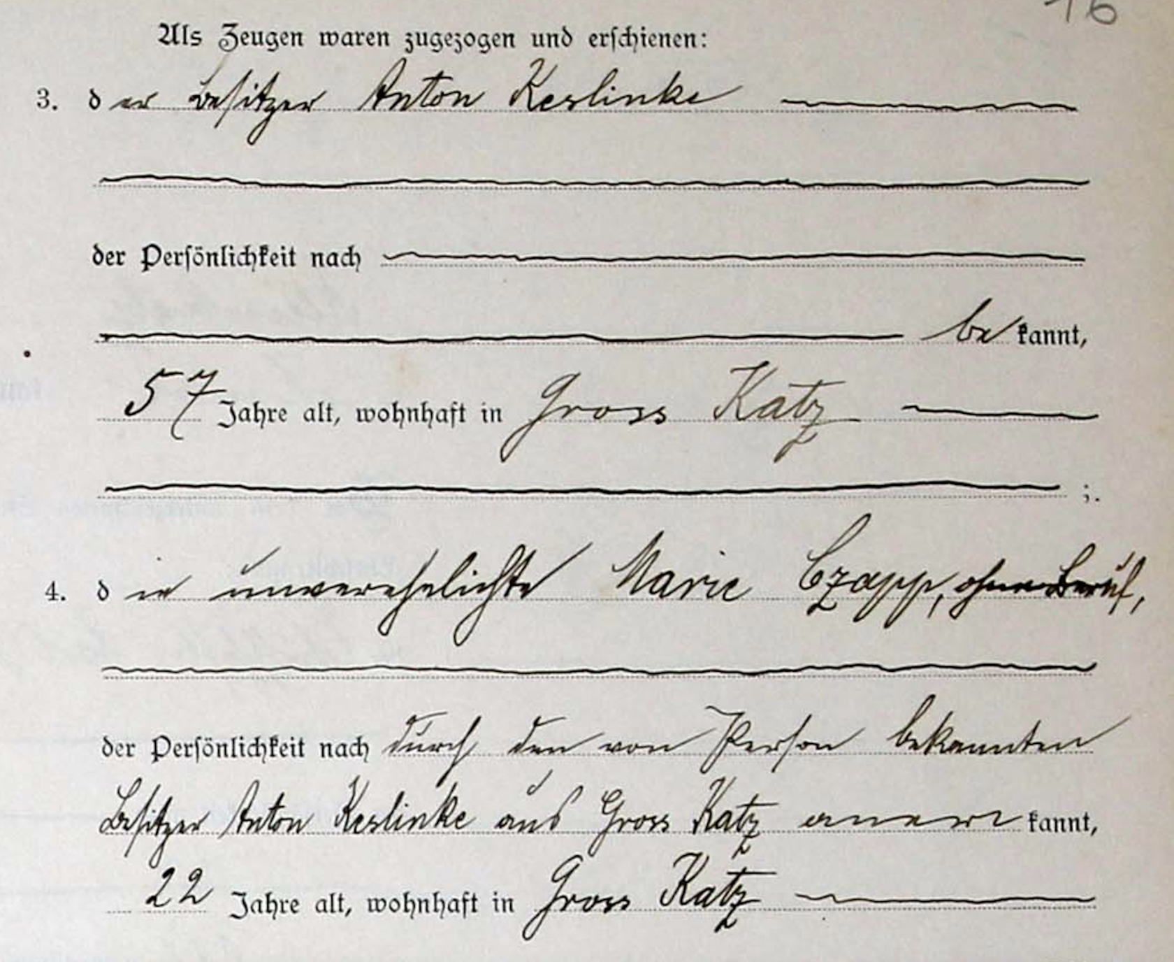 Świadkowie: Antoni Keslinke, l. 57, zam. Wielki Kack oraz ??? Maria Czapp