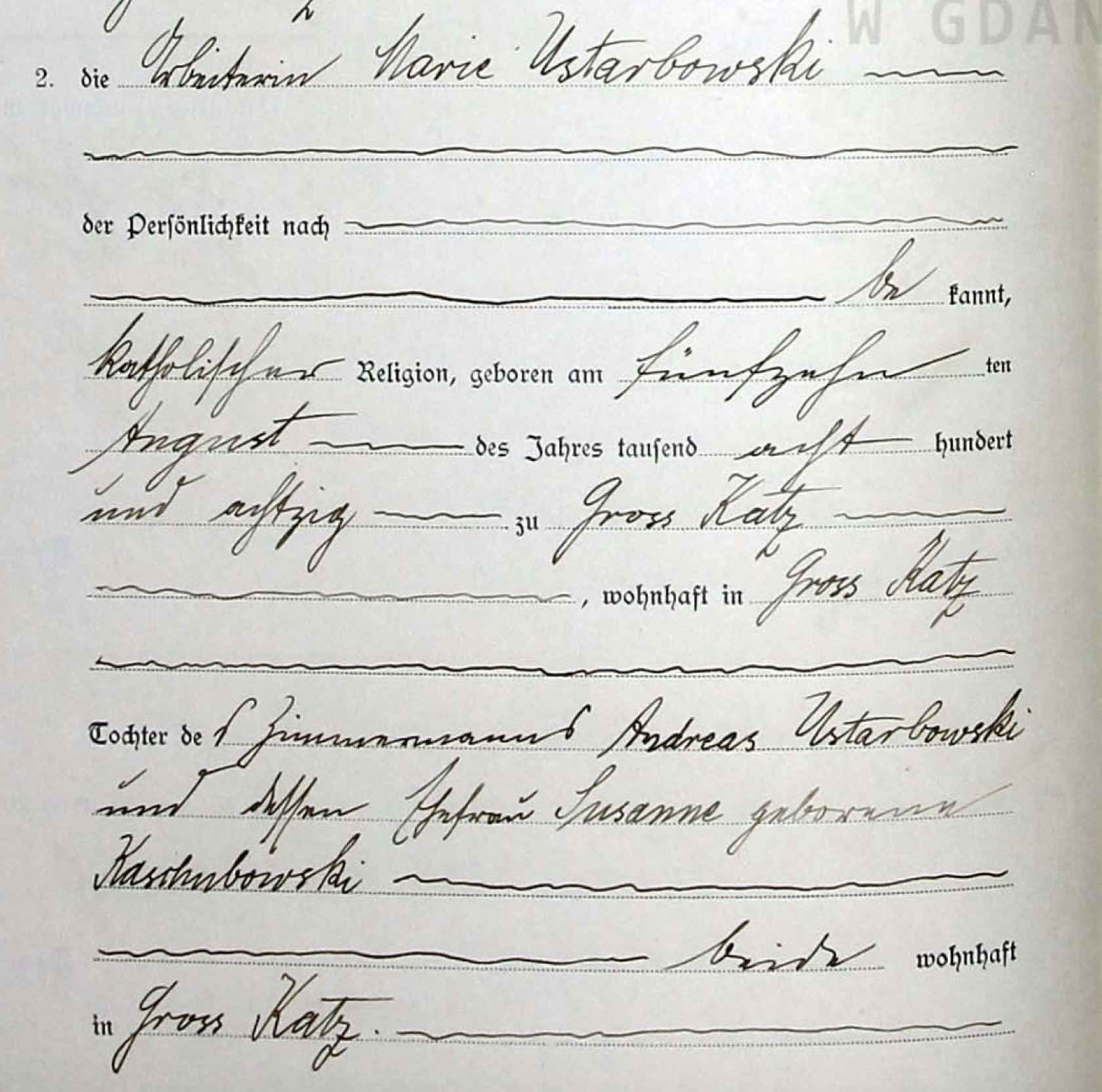 Panna młoda: ??? Maria Ustarbowska, katoliczka, urodzona 15 (?) sierpnia 1880 w Wielkim Kacku, zamieszkała w Wielkim Kacku, córka ???? Andrzeja Ustarbowskiego i ?????? Zuzanny Kashubowskiej (Kaszubowskiej), zamieszkałych w Wielkim Kacku.