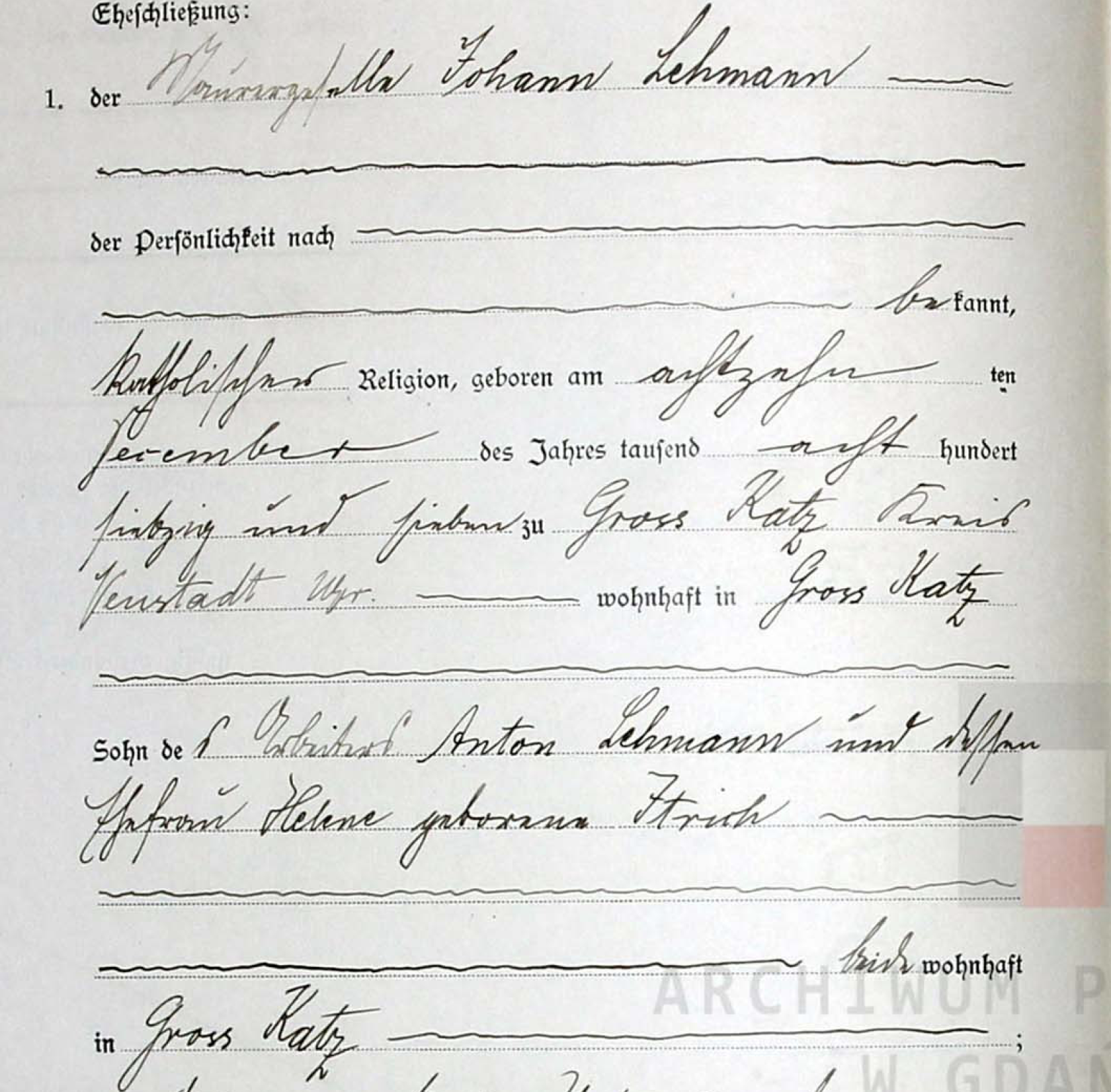 Pan młody: Jan Lehmann, katolik, urodzony w ?????, zamieszkały w Wielkim Kacku, syn ???? Antoniego Lehmanna i Heleny ????, zamieszkałych w Wielkim Kacku.