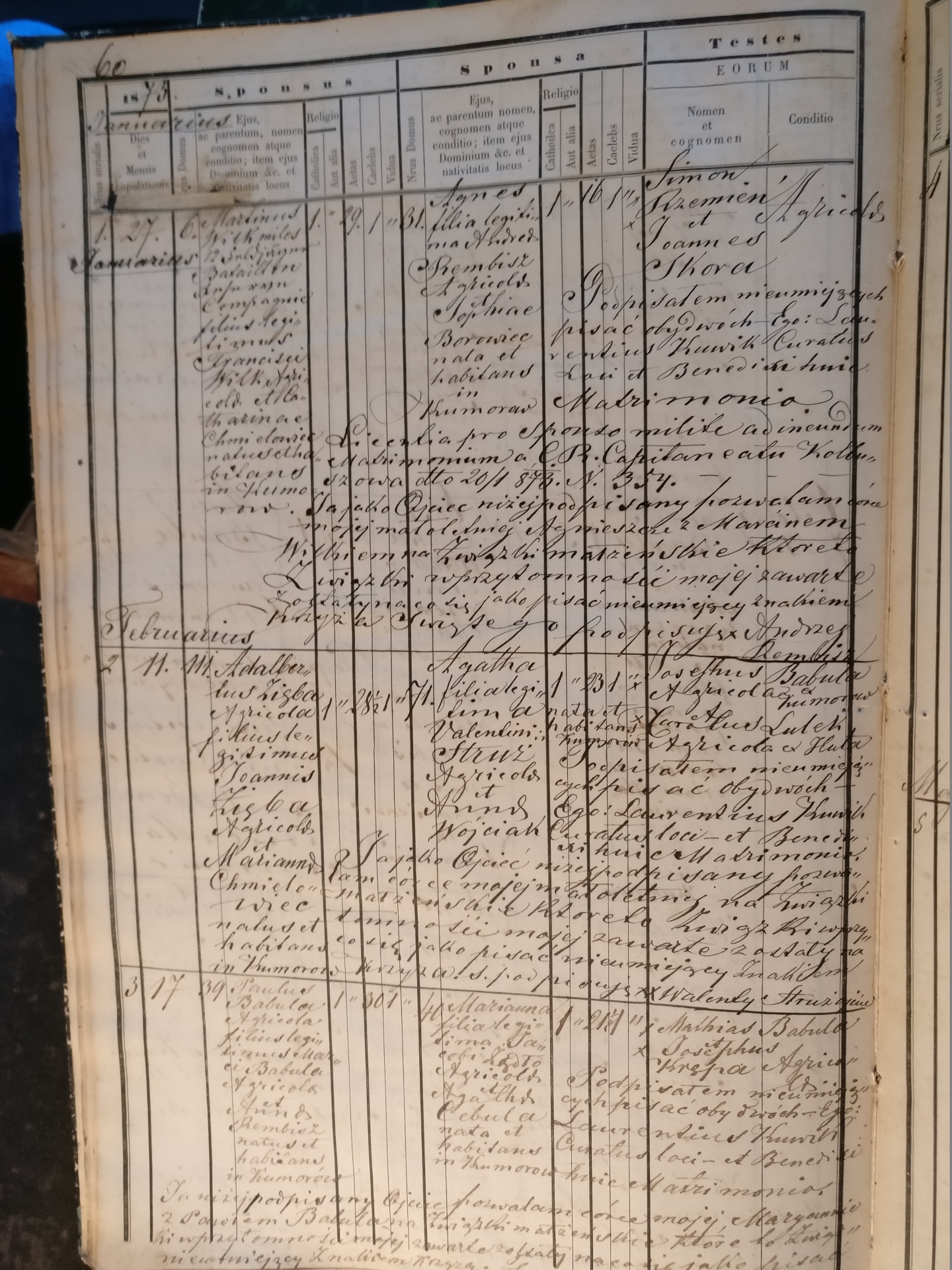 Proszę o pomoc w odczytaniu aktu małżeństwa nr 1. Marcina Wilka i Agnieszki Rembisz. Jest to zdjęcie z Księgi małżeństw dla Komorowa (parafia Ostrowy [Tuszowskie]).