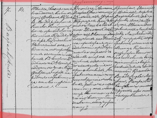 Włościan: Ignacego i Julianny z Morskich, ślubnych małżonków Ważejewskich syna, z mieszczan: Jana i Benedyktyny z Łaszkiewiczów, ślubnych małżonków Łaszkiewiczów córką, małżeństwem połączył i w obliczu kościoła uroczyście pobłogosławił, w obecności wiary dostojnych świadków, włościan: Władysława Morskiego, Piotra Podkańskiego i wielu innych udział w tym akcie biorących.