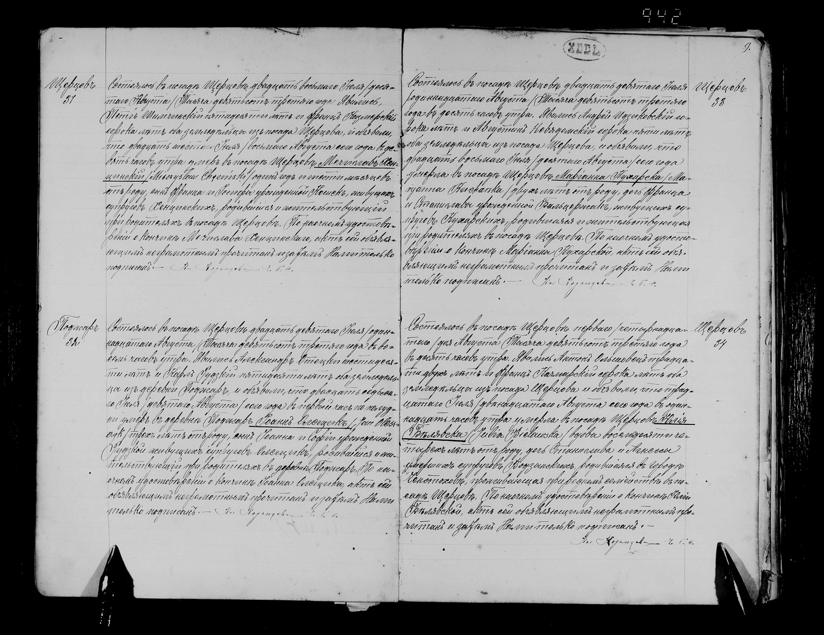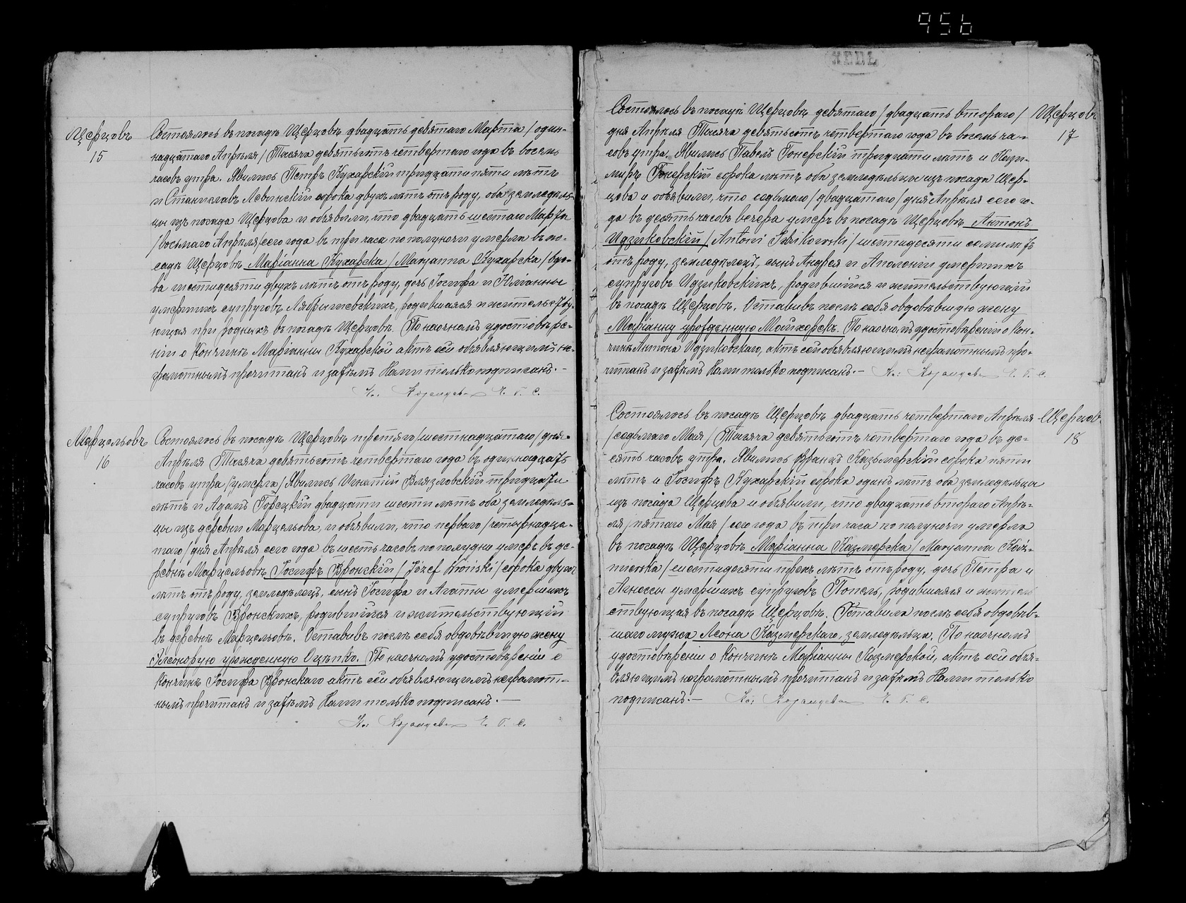 Działo się w mieście Szczerców 10.01.1870 roku o godz. 2 po południu. Stawił się: Franciszek Gawroński, 23 lata, gospodarz, zamieszkały na Niwach, w obecności: Stanisława Krutskiego 37 lat i Antoniego Wulkiewicza 36 lat mających, gospodarzy zamieszkałych na Niwach i okazał nam dziecię płci żeńskiej oświadczając, że ono urodziło się w tutejszej wsi Niwy 09.01 bieżącego roku o godz. 5 po południu, od ślubnej jego żony Józefy urodzonej Kazmierczak, 37 lata mającej. Dziecięciu temu na chrzcie świętym dokonanym dzisiaj, przez ks. Mikołaja Dąbrowicz, dano imię: Marcjanna, a chrzestnymi jego byli: Jan Krupski i Marianna Wulkiewicz. Akt ten oświadczającemu i świadkom odczytany i przez nas podpisany, obecni niepiśmienni nie mogli podpisać.