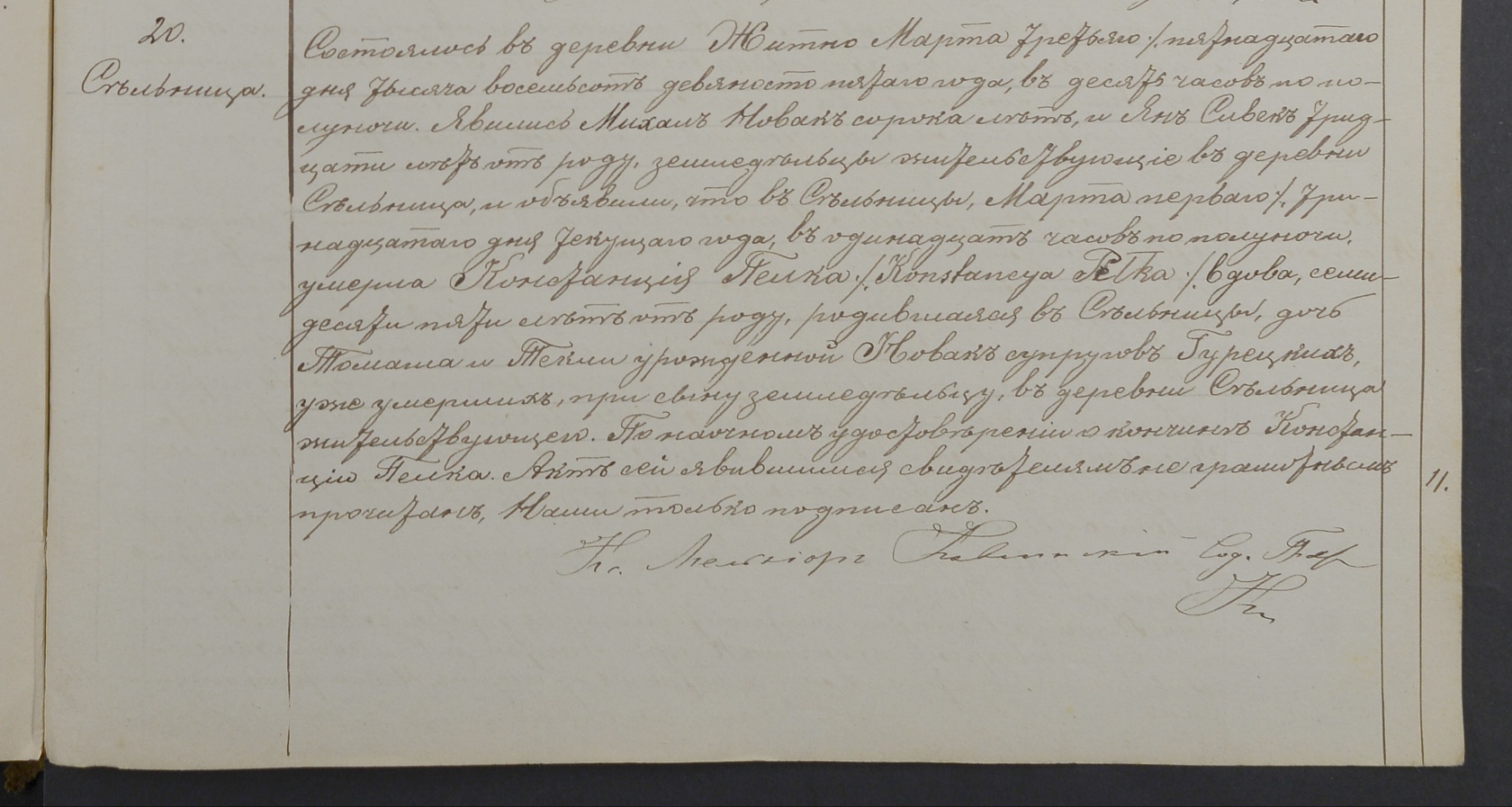 działo się we wsi Żytno 03/15.03.1895 roku o godz. 10 po północy. Stawili się: Michał Nowak, 40 lat i Jan Siwek, 30 lat mających, gospodarze zamieszkali we wsi Sielnica i oświadczyli, że w Sielnicy 01/13.03 bieżącego roku o godz. 11 po północy umarła Konstancja Pełka, wdowa, 75 lat mająca, urodzona w Sielnicy, córka Tomasza i Tekli urodzonej Nowak małżonków Góreckich, już zmarłych, przy synu gospodarzu we wsi Sielnica zamieszkała. Po naocznym potwierdzeniu zgonu Konstancji Pełka akt ten obecnym świadkom niepiśmiennym odczytany, przez nas tylko podpisany.