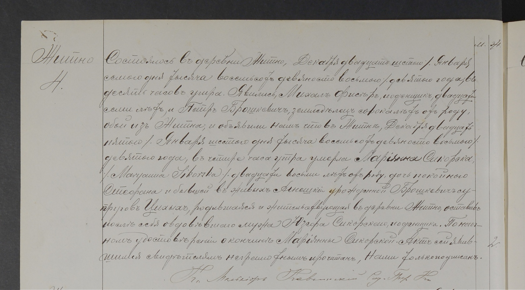Działo się we wsi Żytno 26.12.1898/07.01.1899 roku o godz. 10 rano. Stawili się: Michał Fisier, wyrobnik, 27 lat i Paweł Broszkiewicz, gospodarz, 40 lata mający, obaj z Żytna i oświadczyli nam, że w Żytnie 25.12.1898/06.01.1899 roku o godz. 4 ano umarła Marianna Sikorska, 28 lat mająca, córka zmarłego Stefana i żyjącej Agnieszki urodzonej Broszkiewicz małżonków Cichych, urodzona i zamieszkała we wsi Żytno, zostawiła po sobie owdowiałego męża Józefa Sikorskiego, wyrobnika. Po naocznym potwierdzeniu zgonu Marianny Sikorskiej akt ten stawającym świadkom niepiśmiennym odczytany, przez nas tylko podpisany.