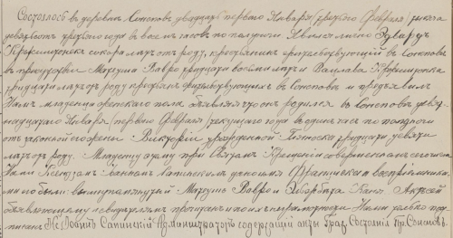 Ślub poprzedziły trzy ogłoszenia publikowane w tutejszym parafialnym kościele. Nowożeńcy oświadczyli, że umowa ślubna między nimi zawierana nie była. Religijny obrzęd ślubu dokonany przez ks. Jana Sapińskiego, miejscowego administratora. Akt ten nowożeńcom i świadkom przeczytany i z powodu ich niepiśmienności przez nas tylko podpisany.