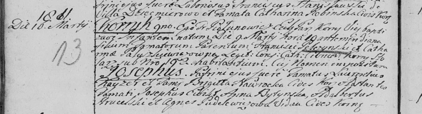 rodzice: sławetni Franciszek Pelczyński i Katarzyna Paluszkiewiczówna, ślubni małżonkowie, obywatele kórniccy, stolarzostwo, zamieszkali pod nr. 192