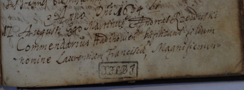 Mała prośba zdjęcie z metryki pod linkiem. Jeśli dobrze rozumiem August Marcin Andrzej Wolski ochrzcił Wawrzyńca Franciszka, ale po drodze chyba oznacozny jest jego zawód comendarius? i jeszcze jeden wyraz na końcu magnificorum? z góry dziękuję za pomoc. pozdrowienia Radek