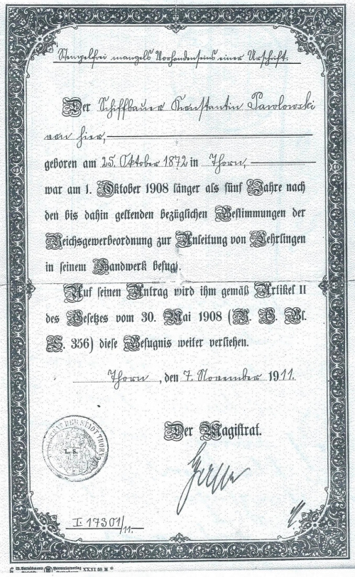 1 października 1908 roku, po 5 latach[praktyki] zgodnie z przepisami handlowymi rzeszy