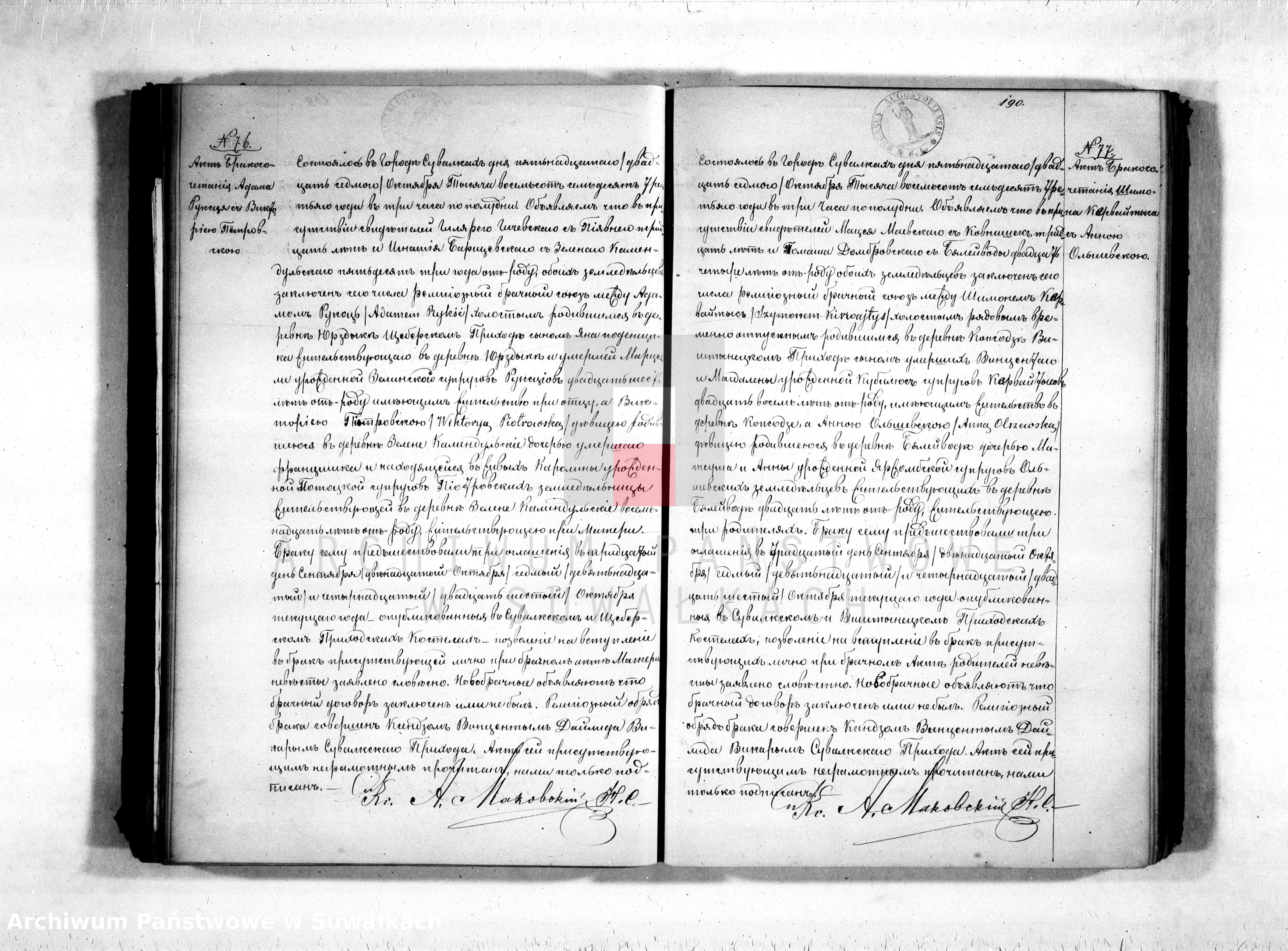 To i ja dorzucę ślub Szymona i Anny Olszewskiej z 1873r./par. Suwałki (akt 77)