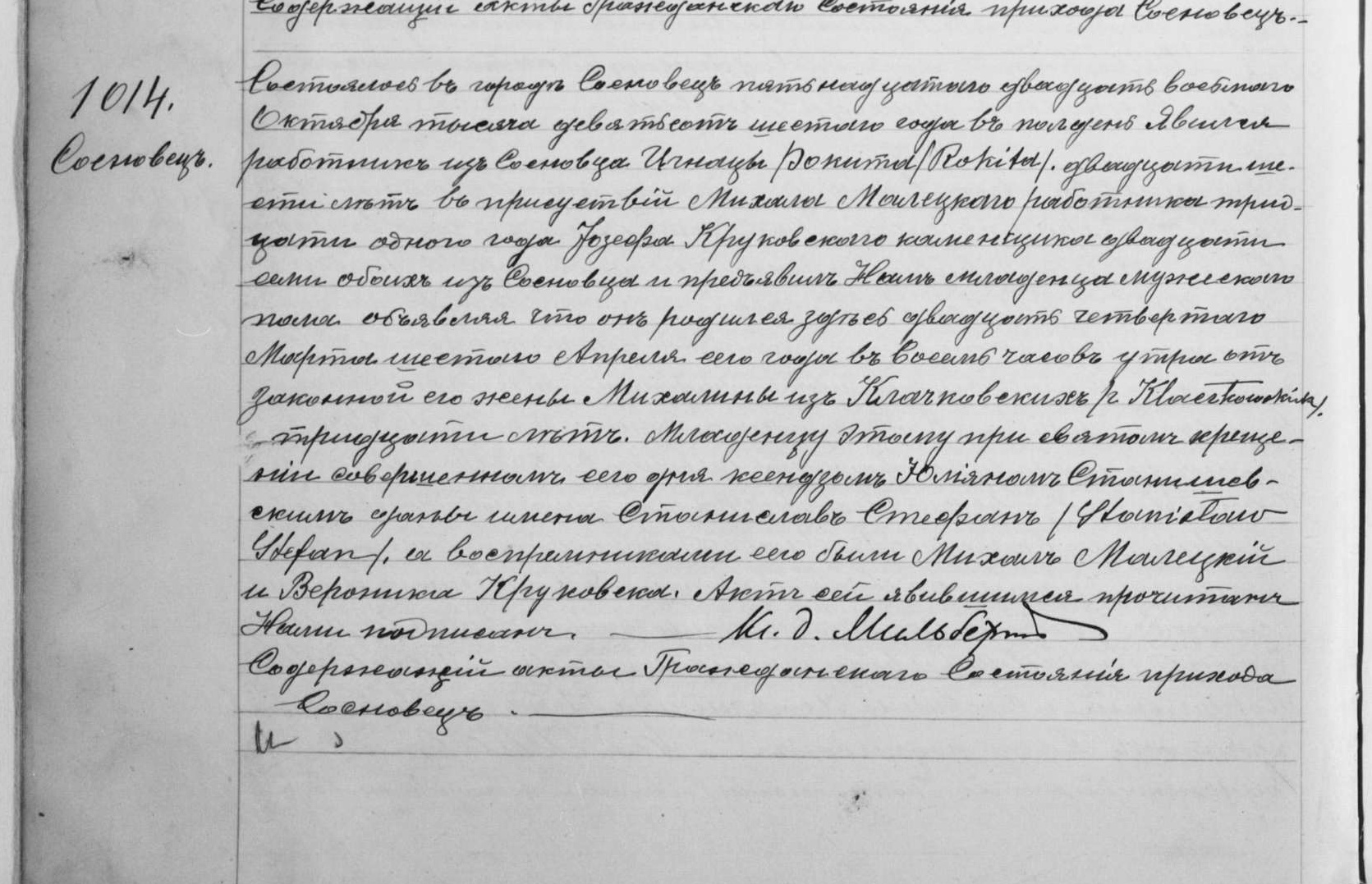 Działo się w mieście Sosnowiec 15/28 października 1906 roku w południe. Stawił się robotnik z Sosnowca Ignacy ROKITA lat 26w obecności Michała Maleckiego robotnika lat 31 i Józefa Krukowskiego murarza lat 27 obydwu z Sosnowca i okazał nam dziecko męskiej płci objaśniając, że urodziło się tutaj 24 marca/6 kwietnia tego roku o godzinie 7 rano od ślubnej jego żony Michaliny z Kłaczkowskich lat 30. Dziecku temu na chrzcie świętym celebrowany dzisiejszego dnia przez księdza Juliana Staniszewskiego dano imiona STANISŁAW STEFAN a rodzicami chrzestnymi byli Michał Malecki i Weronika Krukowska. Akt ten obecnym przeczytany i przez nas podpisany został. Ks. (…)