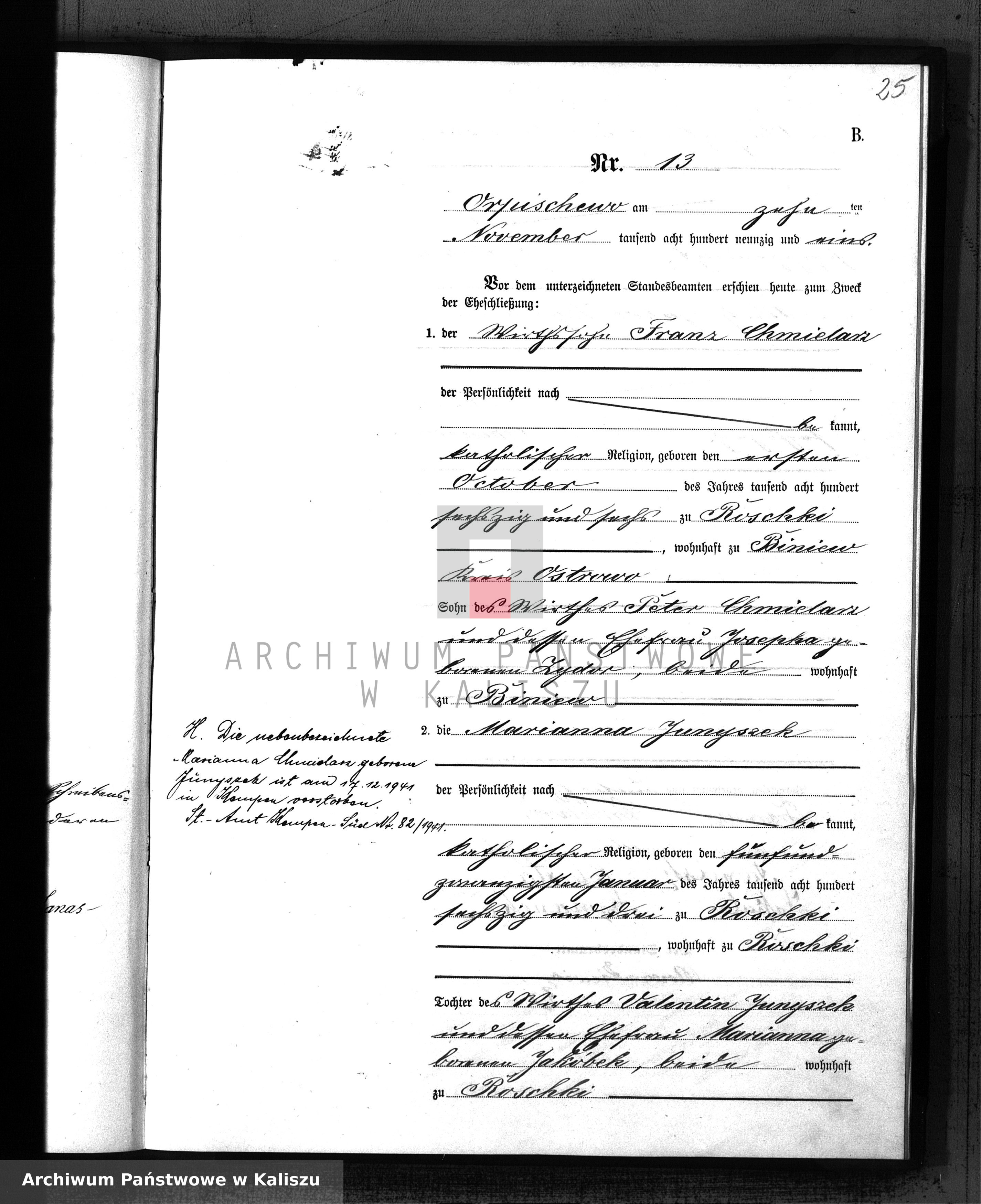 Akt ślubu 13/1891 Chmielarz Franciszek z Marianna Janyszek paraf. Orpiszew