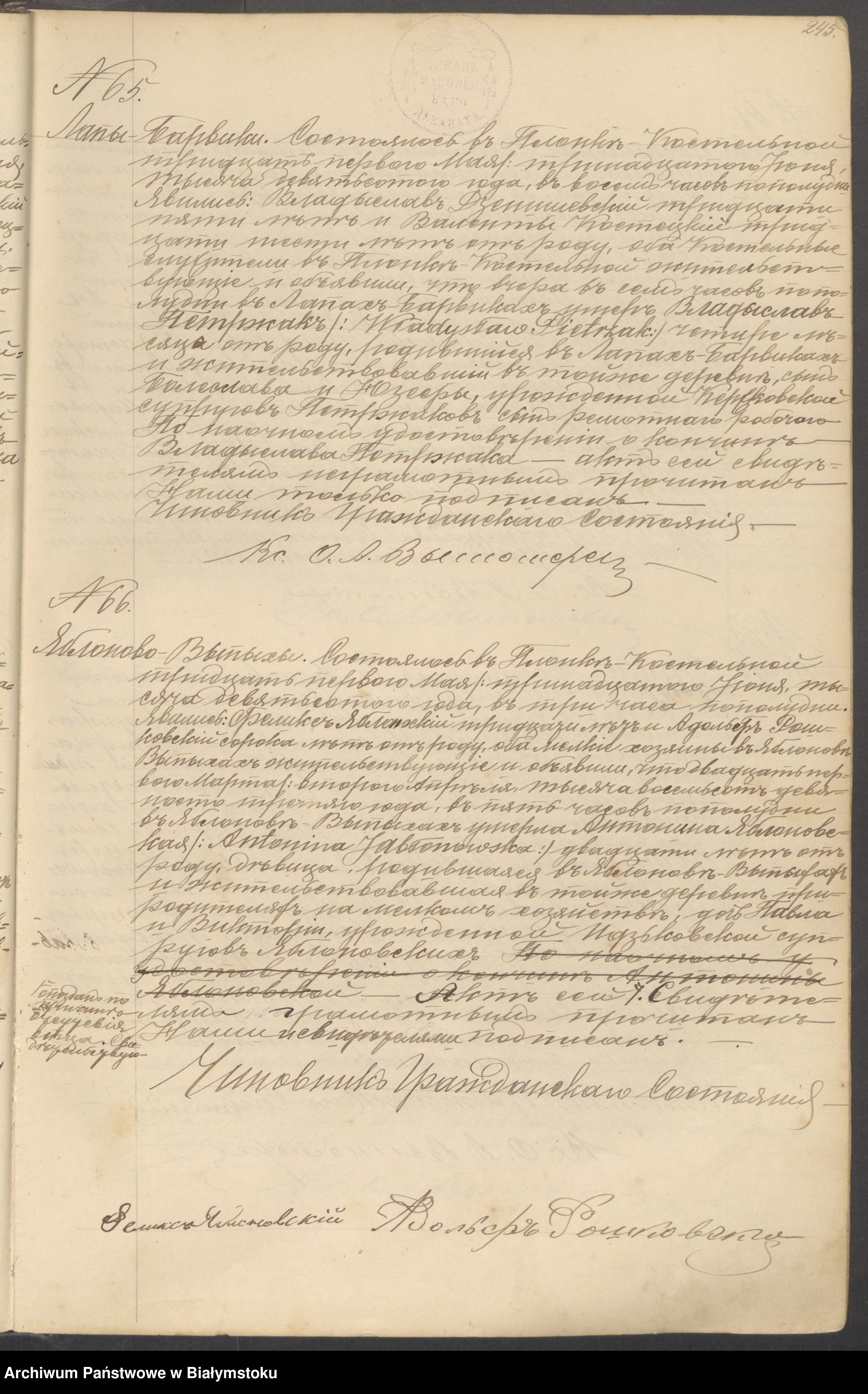 U, akt nr 66, Jabłonowo Wypychy, parafia Płonka Kościelna, 1900, Antonina Jabłonowska (zgon)