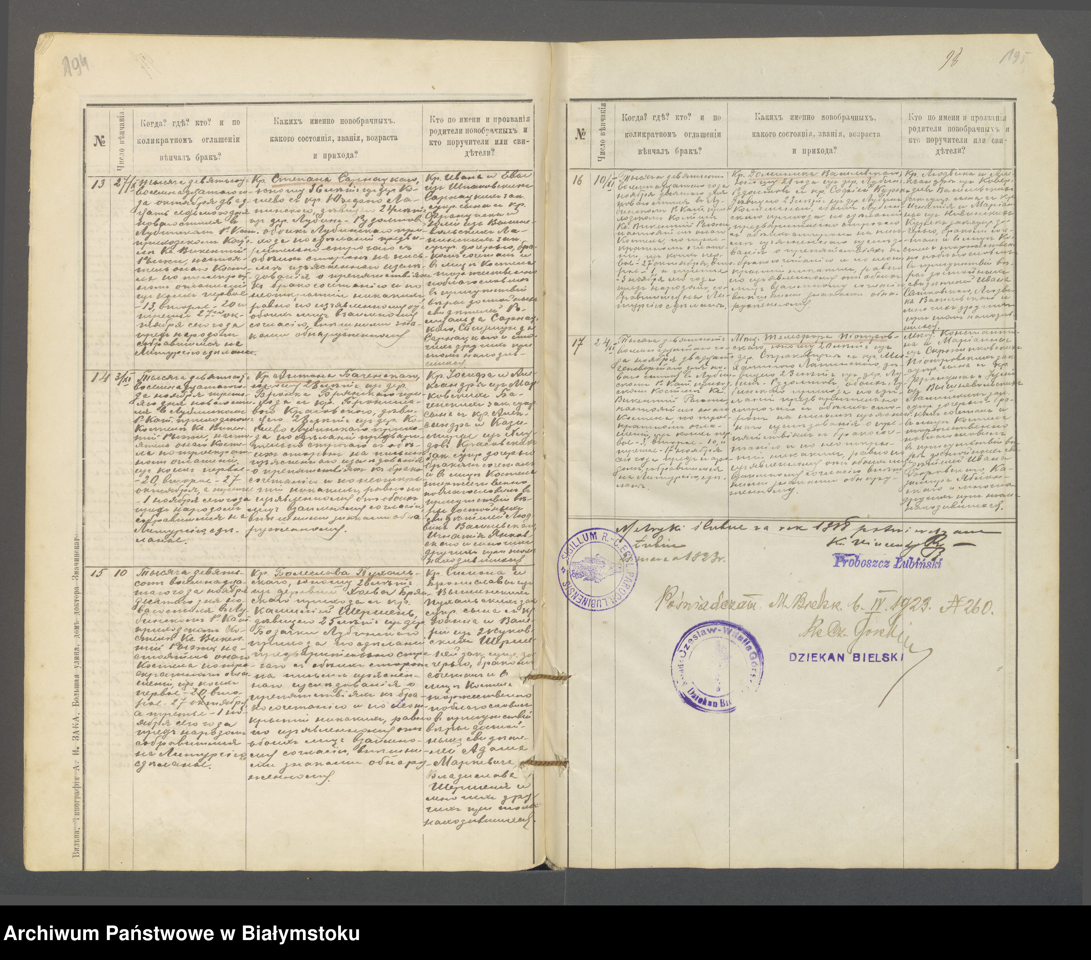 Panie Jerzy i Panie Arku, bardzo dziękuję za wszystkie rady! Zacznę w takim razie od AP Białystok. Byc może uzyskanie kopii metryki urodzenia Telesfora oraz aktu jego ślubu będzie możliwe nawet teraz, gdy czytelnie są zamknięte. Niestety nikt w rodzinie nie posiada już zadnej wiedzy o Konstantym i Mariannie, więc nawet przybliżonych dat ich urodzin/ślubu/zgonu nie znam.
