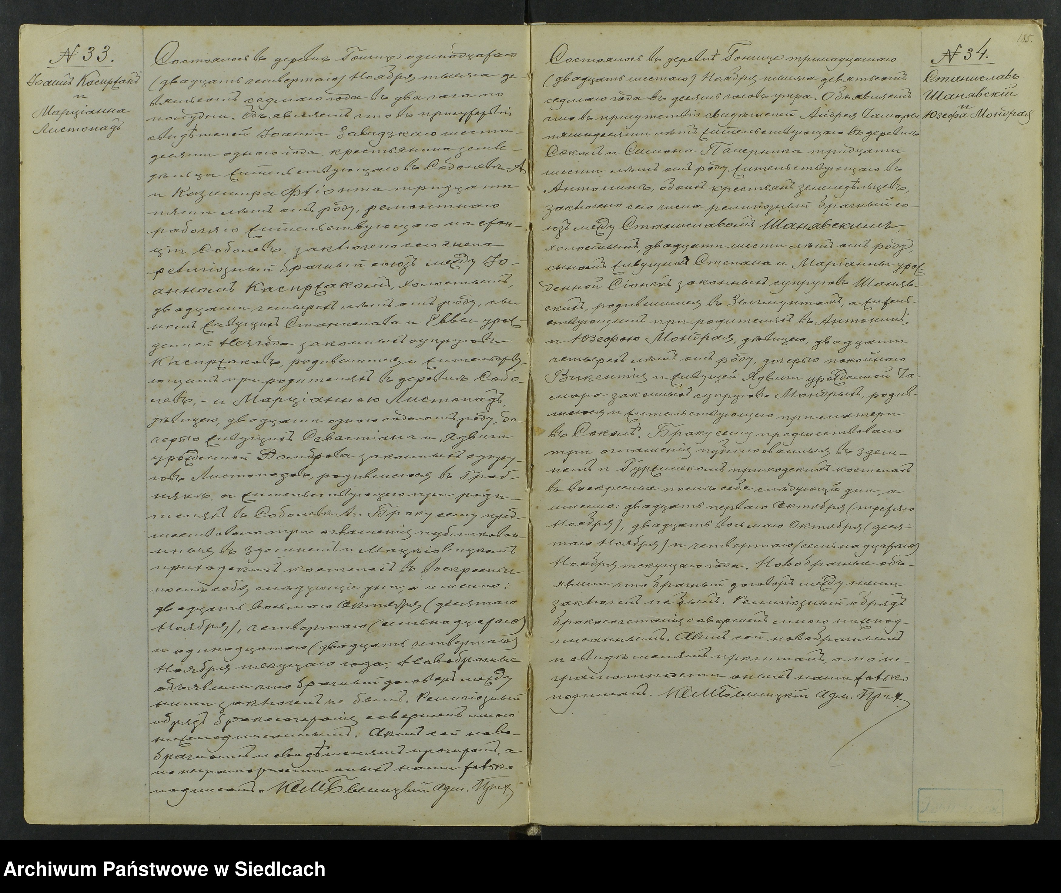 Świadkowie: Andrzej Czamara 50 zam. we wsi Sokół, Szymon Papiernik 36 zam. we wsi Antonin, obaj chłopi rolnicy,