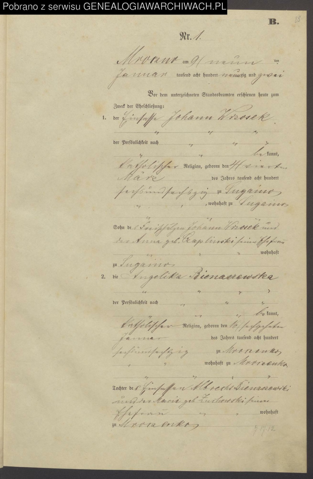Akt ślubu - Bieniaszewska/Wrzosek - USC Mroczno 1892