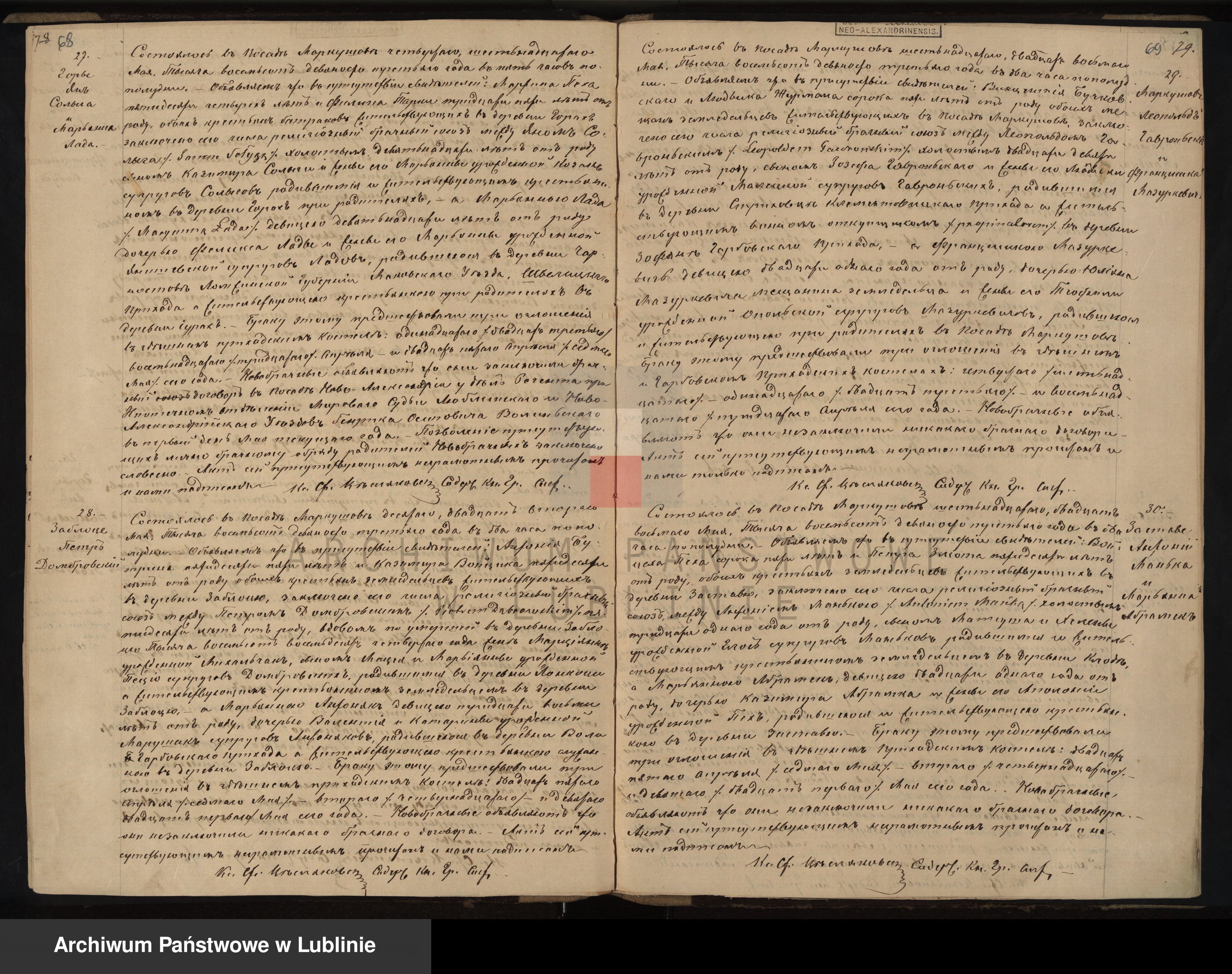 Nowożeńćy oświadczyli, że zawarli umowę przedślubną, w miasteczku Nowa Aleksandria? w kancelarii rejenta, przy hipotecznym oddziale Sądu Pokoju, lublinieckiego i nowoaleksandryjskiego? powiatu, Henryka, Józefowicza Wolińskiego, dnia 1 maja tego roku.