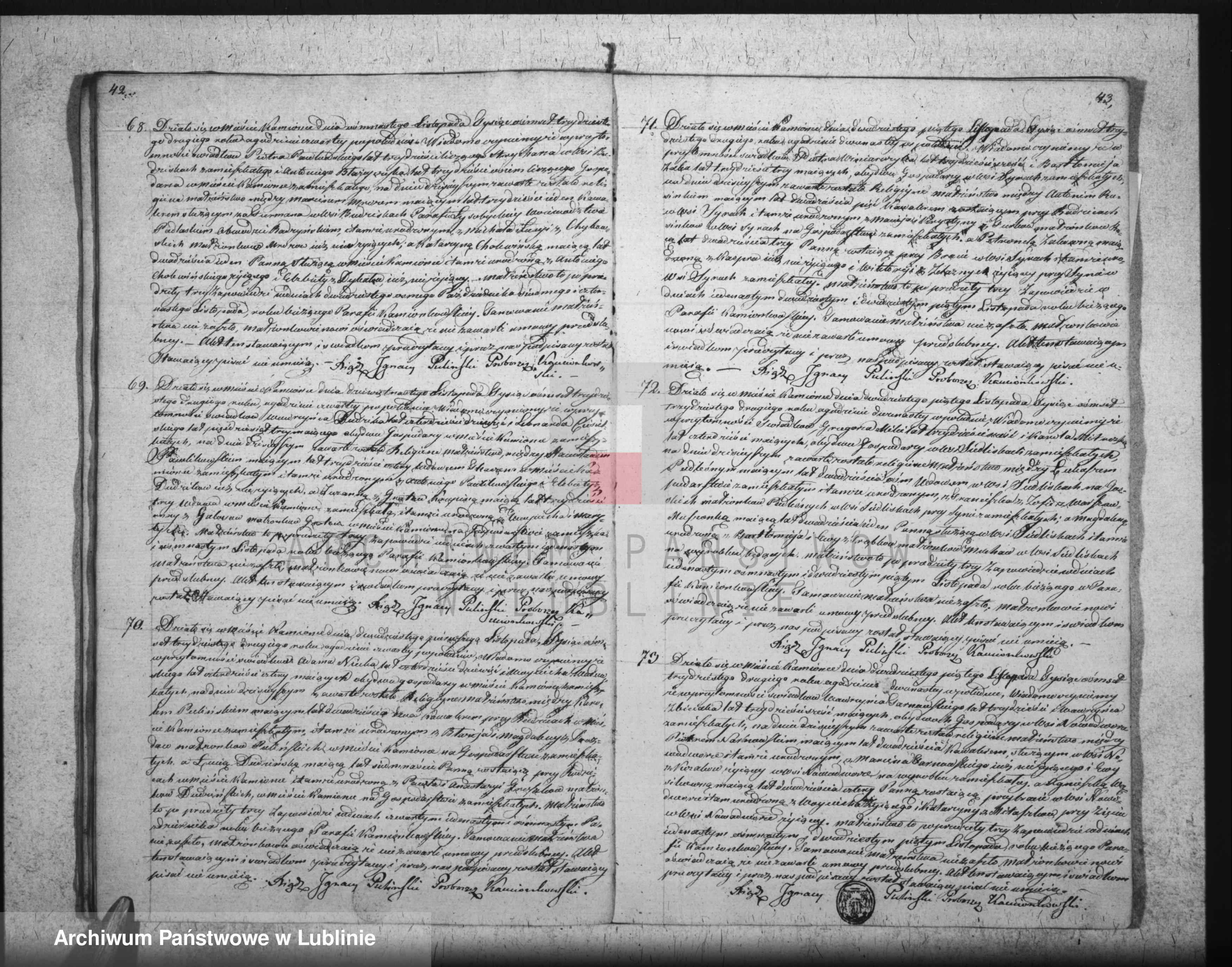 Ślub rodziców Wincentego - Łukasz Podleśny wdowiec (syn Franciszka i Zofii Warszawskiej) i Magdalena Mucha (córka Bartłomieja i Ewy Trąbki) 25.XI.1832r./Siedliska/par. Kamionka (akt nr 72)