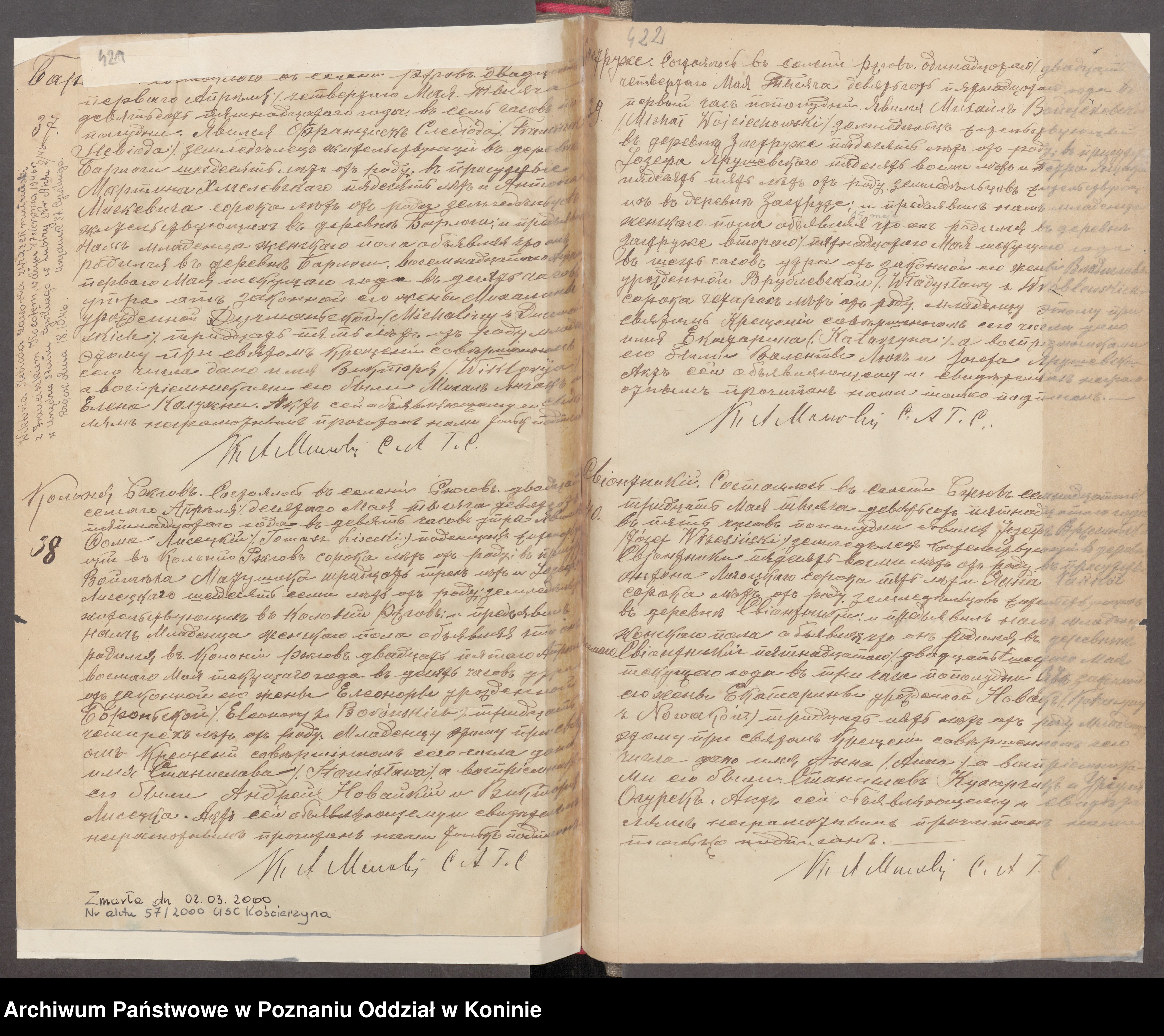 Świadkowie: Szczepan Grzelak 26 rolnik, Antoni Czaplicki 27 wyrobnik, obaj z Czartowa,