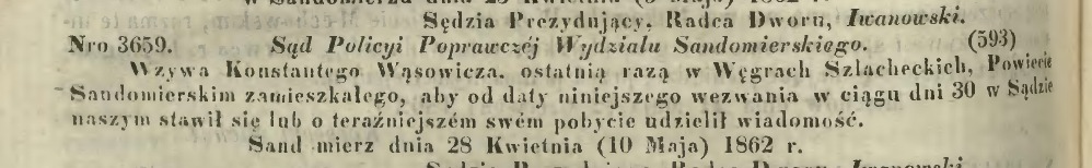 Trafiłem niedawno na informację w Dzienniku Urzędowym Gubernii Radomskiej z 1862 o poszukiwaniu jednego z moich przodków przez policję poprawczą. Zastanawiam się w jakim archiwum mógłbym szukać szczegółów właśnie tej sprawy. Sąd Pokoju Sandomierz? Czy może archiwa policmajstra w AGAD?