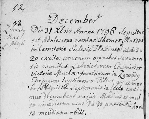 31 XII 1796 na cmentarzu kościoła tłokińskiego został pochowany młodzian imieniem Tomasz Muszak, mający ok. 20 l., opatrzony wszystkimi sakramentami, syn pracowitych Kazimierza i Wiktorii Muchów, mieszkańców Zawad, ślubnych małżonków, który 30 bm. o godz. 12 w południe umarł na suchoty, przez 12 tygodni, będąc obłożnie chorym, leczony przez różnych lekarzy i wieloma lekami.