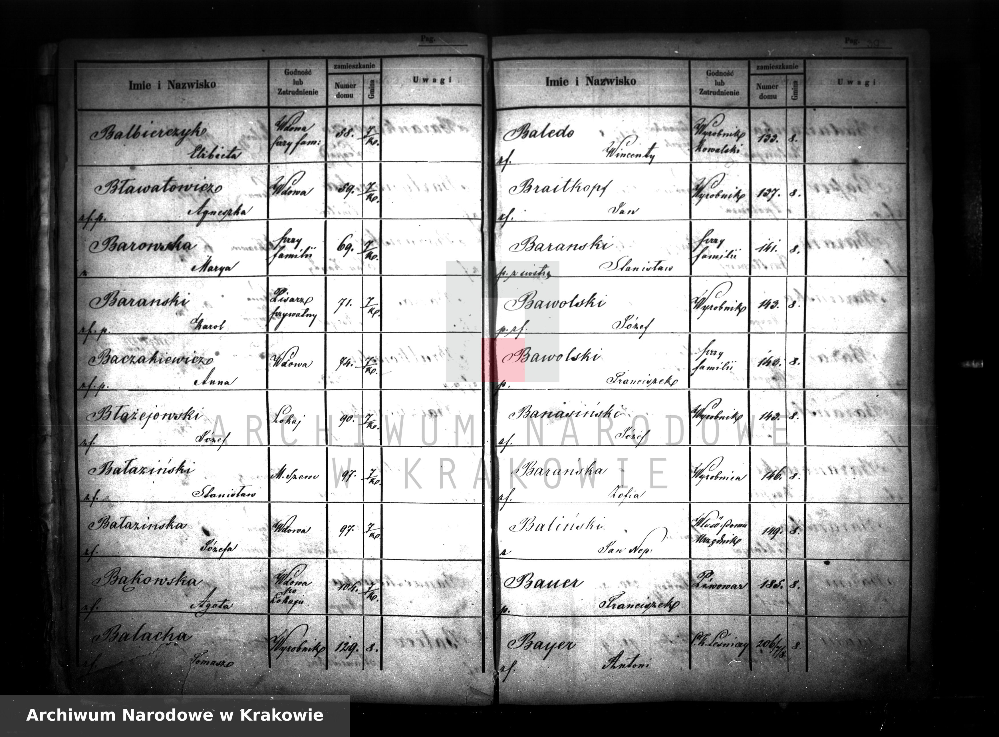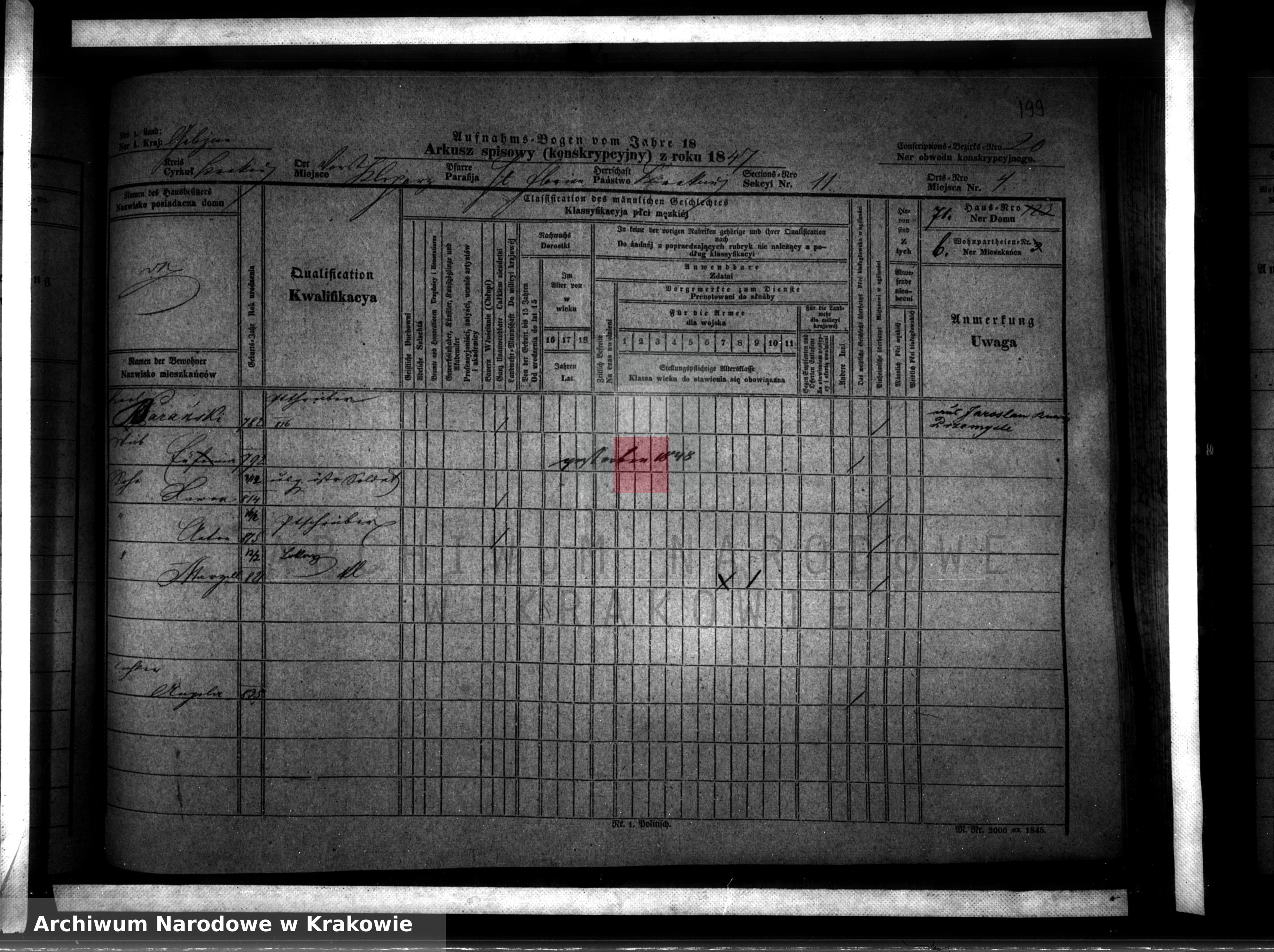odnalazłem wpis z 1847 r. (spis ludności miasta Krakowa), odnoszący się do mojego przodka Karola Barańskiego (pochodzącego z Jarosławia) i Jego rodziny. Udało mi się odczytać imię żony (Eufemia - zgadza się z posiadanymi wcześniej informacjami). Rok urodzenia Eufemii również się zgadza (1792 r.). Bardzo proszę o pomoc w odszyfrowaniu reszty danych ze spisu ludności (z tego o widzę, jest to jęz. niemiecki). Szczególnie zależy mi na pozostałych członkach rodziny i pełnionych funkcjach:
