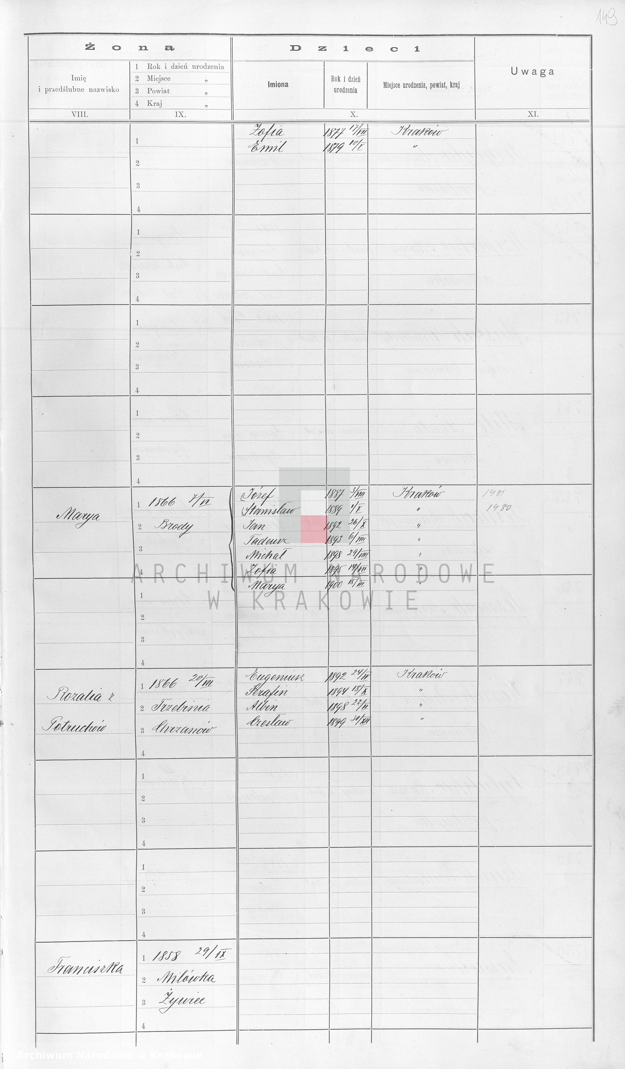 Szukam śladów WOJCIECHA HABINA, który figuruje w spisie ludności Krakowa z roku 1900; wraz z żoną Rozalją z d. Pstrucha (1868-1925). W roku 1910 na spisie ludności figuruje juz tylko Rozalja z dziećmi( 4 synów); po WOJCIECHU nie ma śladu. Przypuszczam ze w tym dziesięcioleciu coś się wydarzyło (śmierć, zaginięcie, wyjazd za granicę) ale nie mogę się doszukać. Proszę o pomoc, podpowiedź.