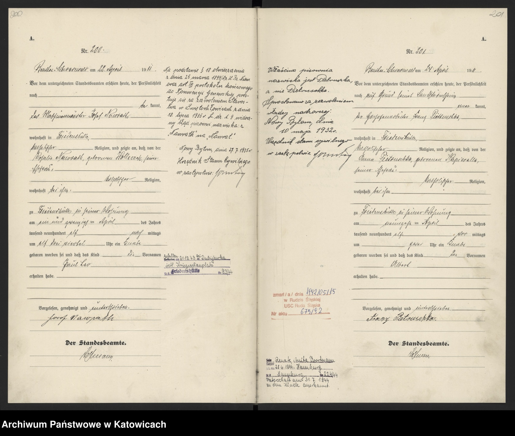 Akt urodzenia Albert Pietruszka, Ruda Śląska 1911 - ok