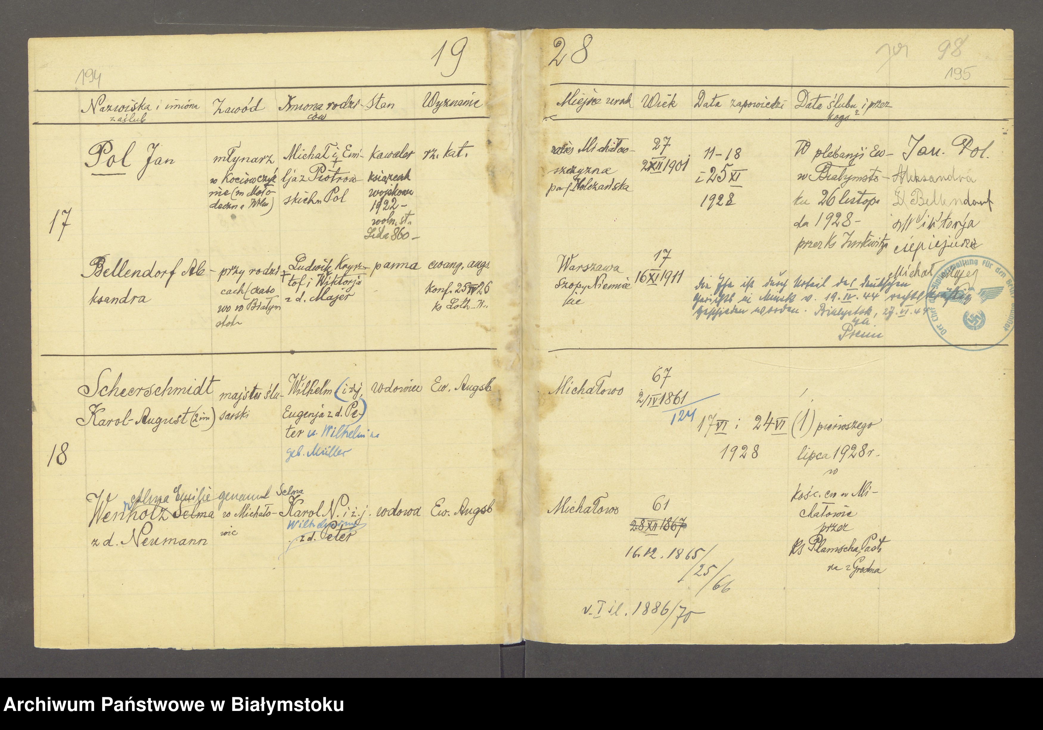 Archiwum posiada akta parafii ewangelicko-augsburskiej w Białymstoku z lat 1841-1902 i może mieć informacje o księgach metrykalnych z lat późniejszych. Prawdopodobnie wymienieni których szukasz w XX wieku mogli byli coraz bardziej związani z Białymstokiem i mogą być odnotowywani w innych białostockich zasobach (własnościowych , podatkowych itp.)
