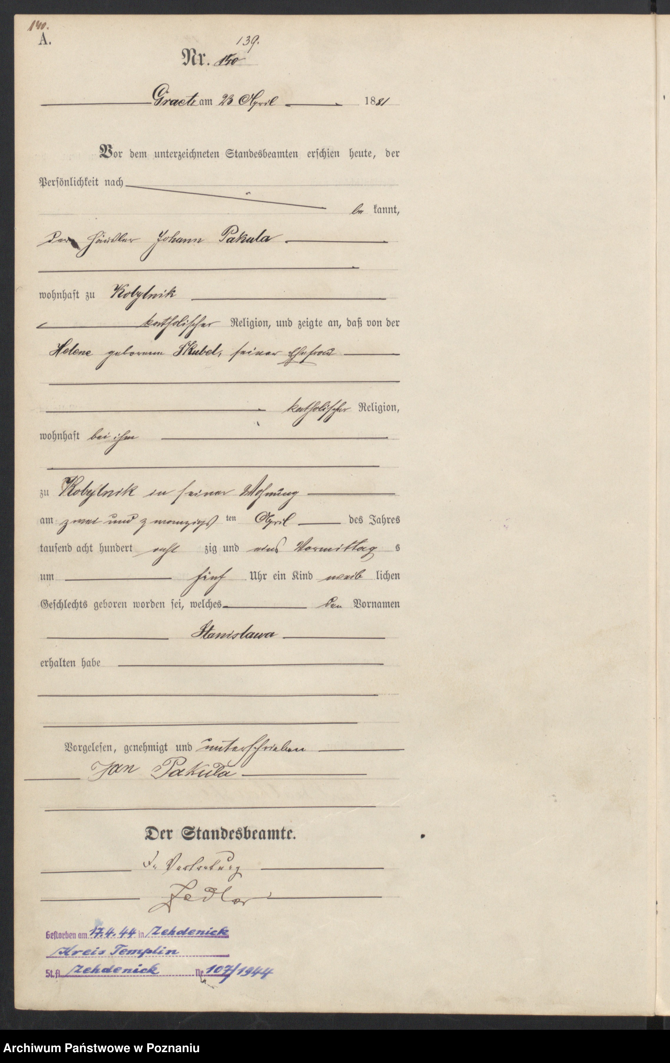 w Kobylnik w jego mieszkaniu 22.04.1881 przed południem