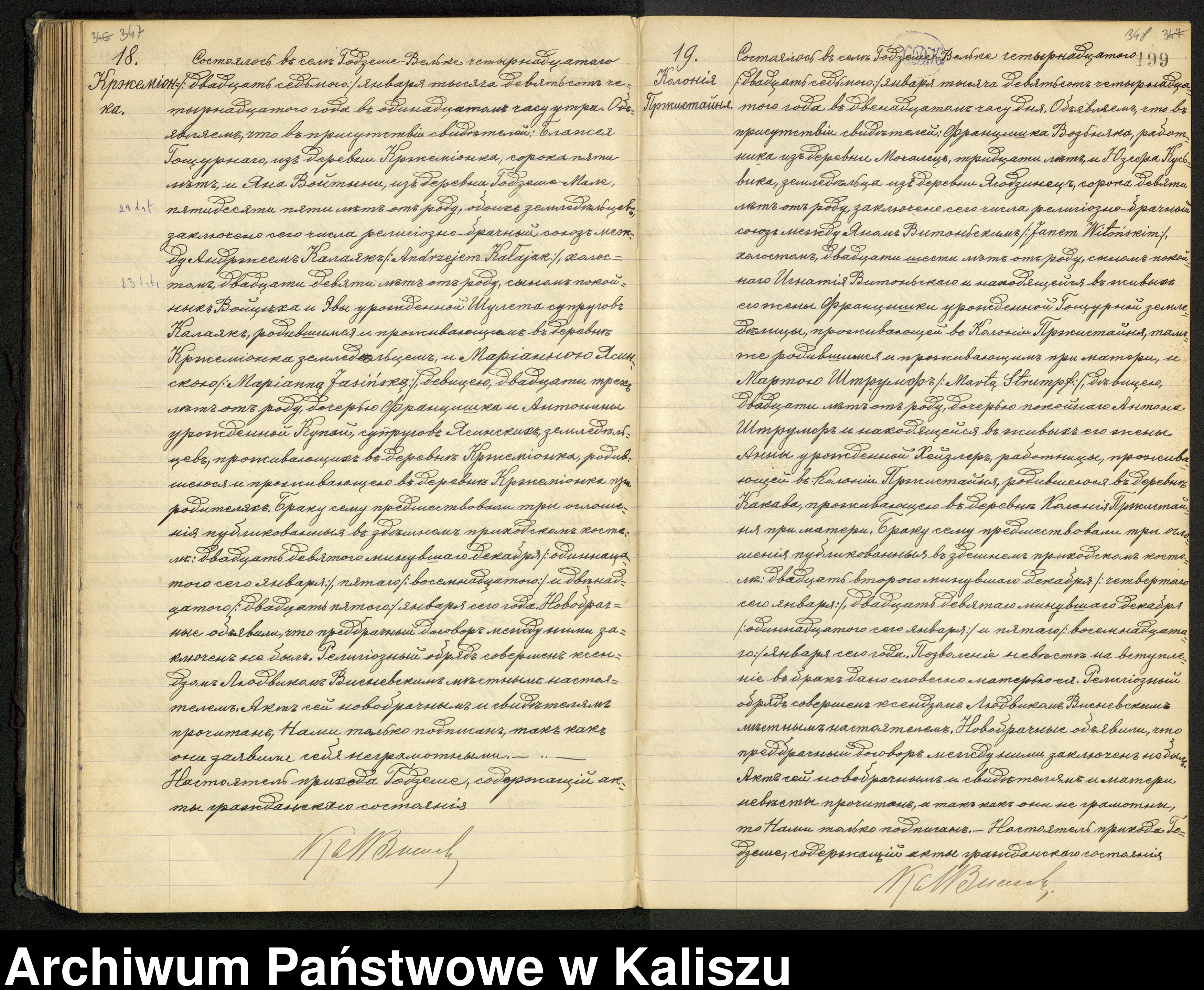 Młody: Jan Witoński, kawaler, lat 26, syn zmarłego Ignacego Witońskiego i żyjącej jego żony Franciszki zd. Goszczurna(?) rolniczki zam. w Koloni Przystajnia, ur. i zam. przy matce w Koloni Przystajnia,
