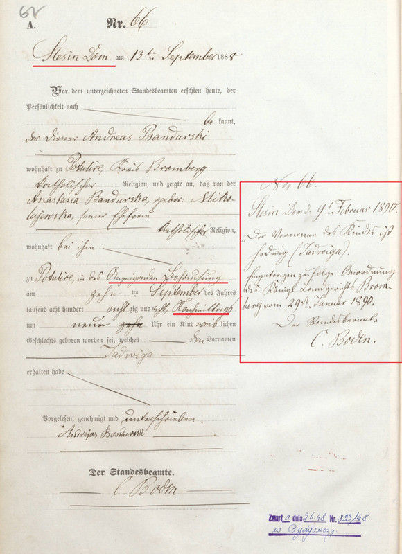 Dopisek podaje prawidłową nazwę imienia : Hedwig(Jadwiga) zamiast wyłącznie polskiej wersji wpisanej pierwotnie. To na podstawie postanowienia Sądu Powiatowego w Bydgoszczy z 29 I 1890.