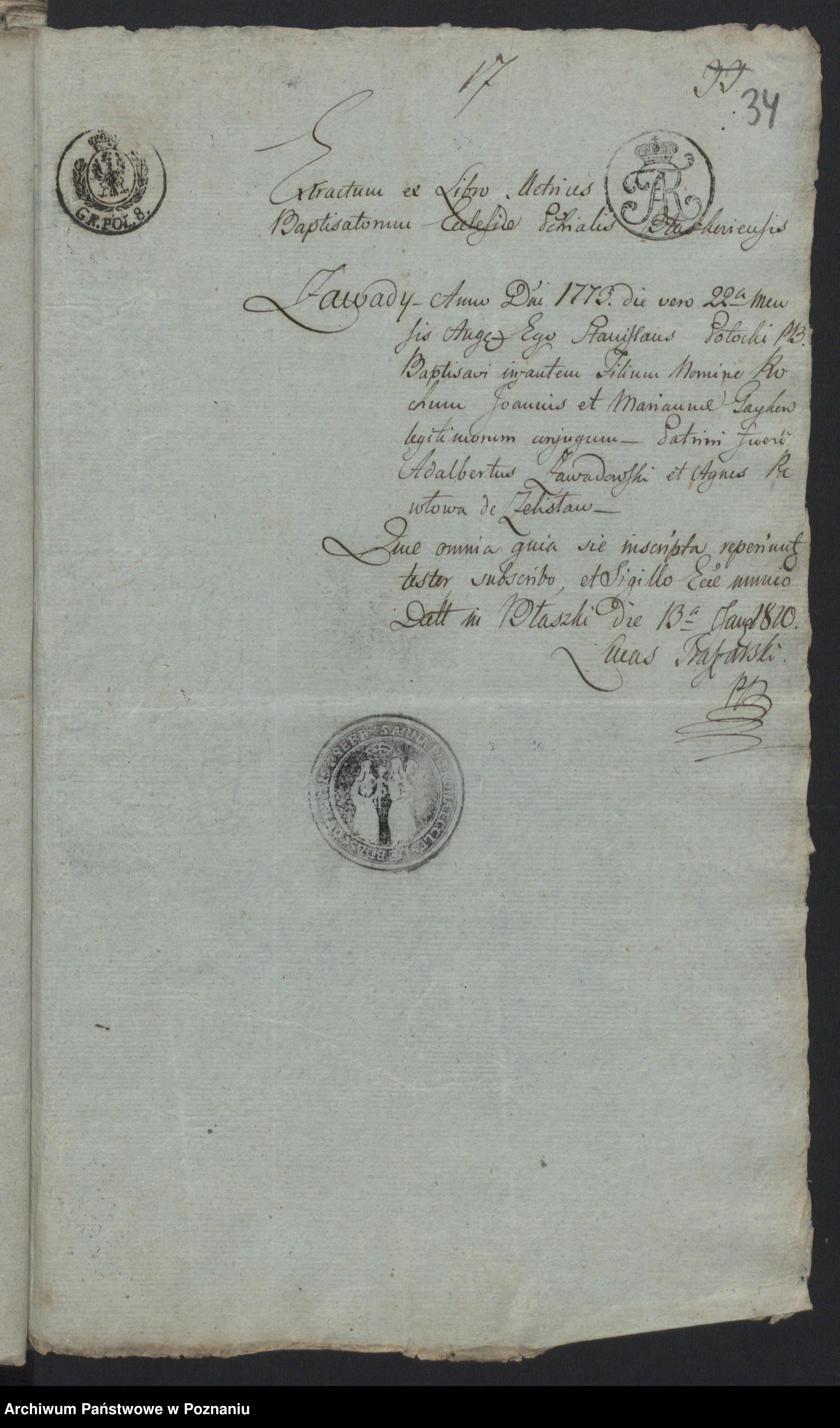 Widziałem ten dokument z parafii Błaszki, ale go nie uwzględniłem, ponieważ w akcie zgonu Rochusa zapisano, że miał 83 lata (w księdze z Jedzychowic nawet napisano 74 lata). Niemniej jednak zastanawiałem się już wcześniej, czy ten nowy Rochus, urodzony w 1773 roku, mógłby być ojcem mojego Rochusa. Jak to sprawdzić?
